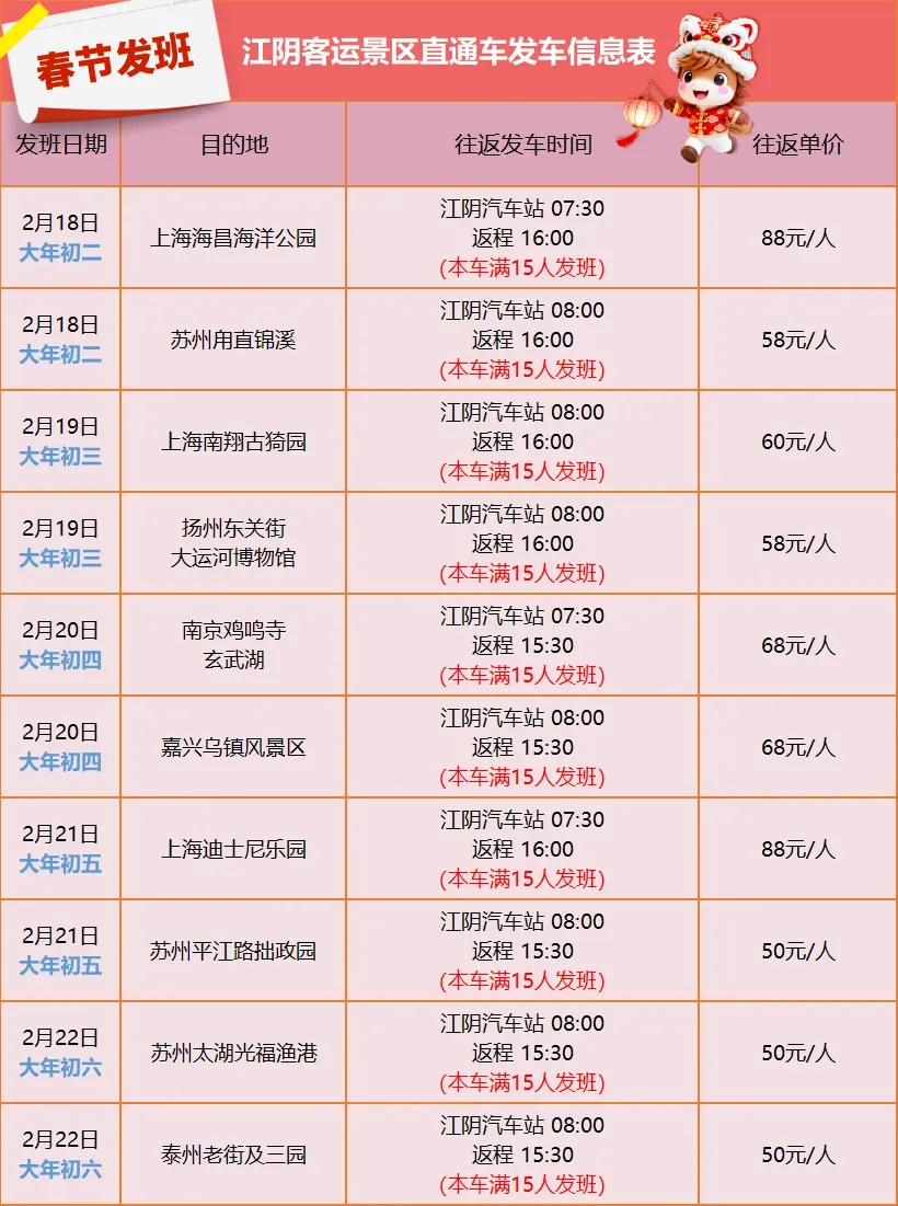 春运进行时 温暖每一程|江阴客运景区直通车带您轻松游览!发车详情 大年初二到初六 购票详情 线上购票