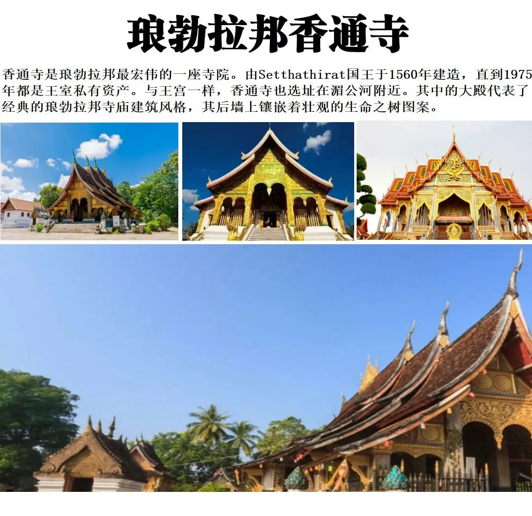 午餐后,前往参观【老挝大皇宫博物馆】, 琅勃拉邦大皇宫是 1909 年为西萨旺皇室建造的,当时整 个老挝已是法国的殖民地,而琅勃拉邦则是已“保护地”形式行使皇权。整个皇宫由西萨旺皇宫 (博物馆主馆)、 琅勃拉邦像安置祠 、普西会议厅和西萨旺·冯国王雕像组成 。 参观博物 馆内部禁止拍照,只能拍外观照片。参观【香通寺 Wat Xieng Thong】—香通寺浓缩了琅勃拉邦古老的寺庙建筑风格。香 通寺是由塞塔提拉王兴建于 1560 年, 一直受王室保护至 1975 年。1887 年遭到破坏,1928年在 S isvang Vong (西萨旺冯) 国王的干预下, 得到了修复。寺院内 8 根粗大的支柱上用黄金刻着图案,把人们的目光引向后面金光闪闪的佛像和光轮覆盖的屋顶。寺院外面的后墙 上镶嵌着栩栩如生的树的图案, 里面置有一个很独特的佛像。佛身上体现着老挝的特点,如卷至脚踝的长袍,手支撑着头,姿势优美。这尊佛是塞拉提拉亡于 1569 年下令铸造的 。香通寺保存着老挝最后一代国王(西萨旺·冯)的遗骨,还有历代国王所使用的金碧辉煌的灵车。从前,香通寺就是举行最高仪式的地方。寺庙 、王宫 、唇齿相依, 国王的婚礼葬礼在寺庙里举行,高僧的法事到王宫里去办。可见 16 世纪以后,佛教与老挝的王国统治已经难分难 解了。所以在人民心里,树是佛 、是神 、是国王,自己只能顶礼膜拜。参观结束后,继而出发,乘坐游船欣赏湄公河观两岸风光,听听音乐,品藏老挝地道啤酒,水果,慢慢悠悠感受老挝的慢生活,十分惬意。晚上自由活动【古城特色夜市】琅勃拉邦的古城反映了19-20世纪欧洲殖民者建造的传统 建筑与城市结构相融合的风格。它独特的镇区保存十分完美,表现了两种截然不同的文化 传统的融合。夜市热闹非凡,当地特色的手工艺, 琳琅满目,物美价廉,在这里您不仅可以淘到自己喜欢的小玩意儿,还可以与淳朴善良的当地人交流,摊主会对您报以灿烂的笑容;晚餐于琅勃拉邦著名夜市自行选择心仪美食。