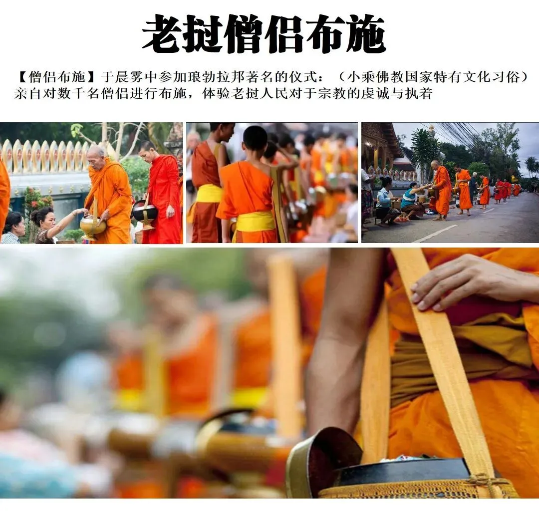 清晨雾中感受 千年传承【僧侣化斋特色民俗布施文化AlmsGivingCeremony】,千年传统不曾改变(小乘佛教国家持有文化习俗),您也可以参与其中对数千名僧侣进行布施 。每天清晨和尚排队沿街化缘,是琅勃拉邦的一大特别景观,等待布施的信徒们,沿街坐着矮凳排列,面前放着一小箩布施的米饭或食品,当各个寺庙的大小和尚挨个排队到来时, 信徒便把面前的米饭或食物捏成小团或分成小份,依次布施给他们,时间持续约半小时。化缘的和尚排成长长的队列,黄色的袈裟微微飘动,在朝阳的斜射下,熠熠生辉,映照出琅勃拉邦人的善良和对宗教的虔诚之心。