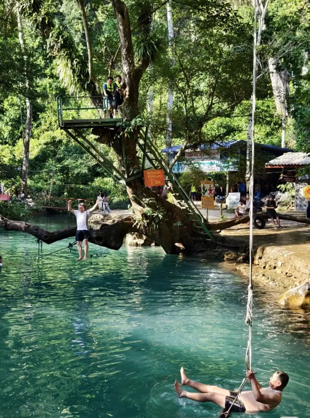 午后适时集中,乘坐嘟嘟车游览【蓝色泻湖】天然的山泉水在原始村落中汇聚成一个游泳池 , 天然的一棵大 树,它的枝叶变成跳台,秋千就荡在河面上,小鱼就在你身边游,只有在老挝的万荣 ,才可以真正享受到与大自然的亲近之感。【坦普坎溶洞】巨大的坦普坎溶洞是老挝人心中神圣的地方,受欢迎的原因是因为溶洞 里的泻湖,主洞室供奉着一座泰国风格的青铜卧佛,有几条幽深的地道可从主洞室分岔进入山腹。