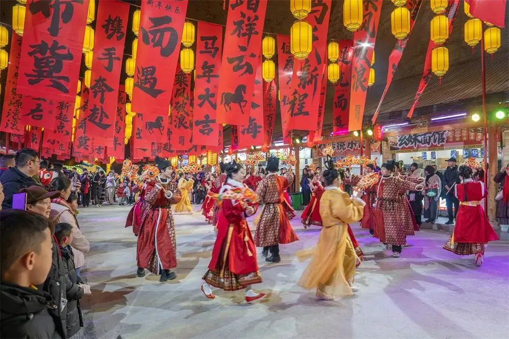 游客王瑞则细数了一路的游玩亮点,直呼过瘾:“走到龙门那里就看到有舞蹈演出,特别壮观,再往里面走有投壶小游戏,特别好玩,体验感蛮好,再往里面走还有很多小吃,场面很热闹,感觉到了浓浓的年味。”