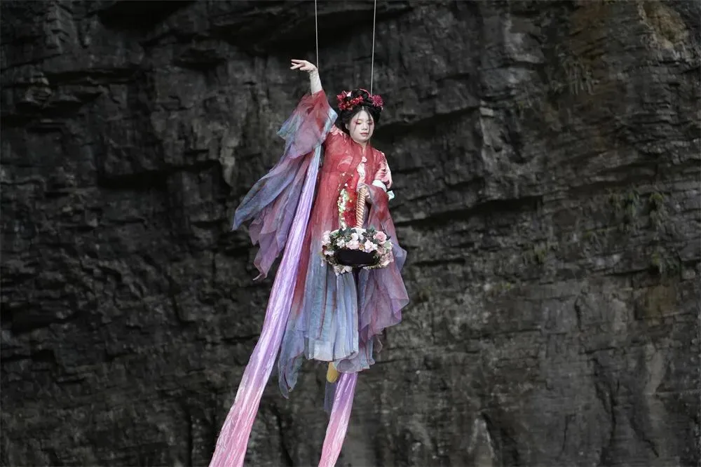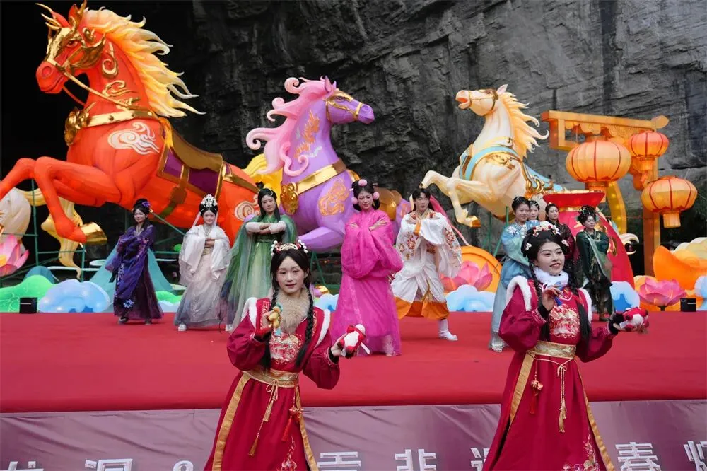 “今年的灯会,我们不只是‘挂灯’,更是‘写灯’,用光影讲述腾龙洞与土家儿女的故事。”利川腾龙洞景区品牌策划总监张芙蓉介绍,本届灯会以“洞藏万象·土家迎新”为设计核心,将地质奇观、本土非遗与新春民俗巧妙糅合,让灯彩成为承载土家文化的鲜活载体。