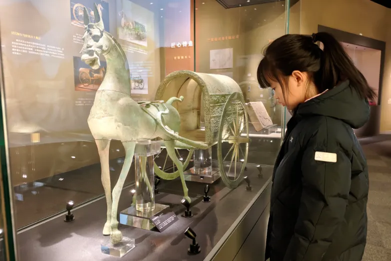 春节期间,资阳市博物馆推出“轮转千年·马跃新程——丙午马年贺岁展”。展出展品80余件,包括四川资阳铜车马、贵州兴义铜车马、人类历史上第一台汽车奔驰1号、徐悲鸿《画马图轴》等重磅车马主题展品,让观众在丰富的展品中感受蓬勃向上、奔腾不息的车马精神。