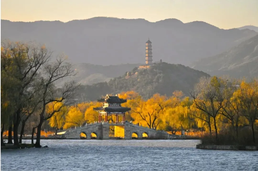 【颐和园】原名清漪园,是清代北京西北郊三山五园。也是皇家园林之最。当年乾隆皇帝数次下江南,因留恋江南美景,便将各地美景都搬到了颐和园内。金秋时节,北京颐和园内层林尽染,彩叶、湖水、远山和古建共同构成一幅幅斑斓的秋日画卷。三步一小景,五步一大美。秋日的午后,金光穿过十七孔桥,倒映在波光粼粼的水面上,此刻终于懂得帝后为何如此偏爱颐和园,也懂得“有了颐和园,何必下江南”。