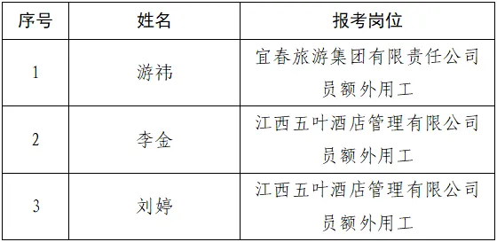 按照《宜春旅游集团有限责任公司公开招聘劳务派遣人员公告》的有关规定,经过报名、资格审查、面试、体检、组织考察等程序,现将3名拟聘用人员名单公示如下: