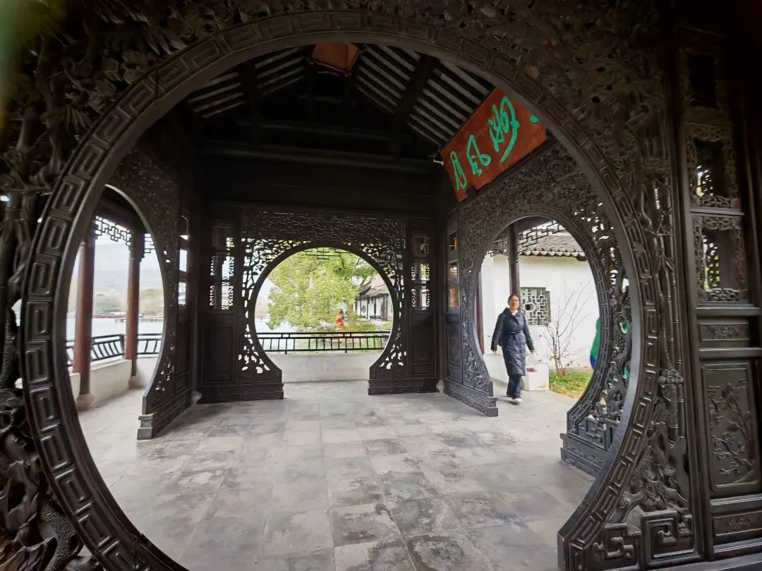 临湖长廊内外皆景,内侧借景依水山庄的小湖山色,外侧俯瞰东湖烟波,是摄影爱好者的绝佳机位。