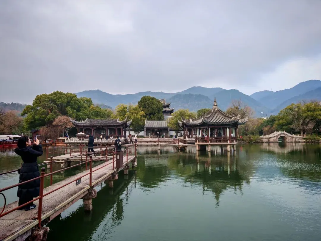 九曲桥如玉带般蜿蜒于水面,串联起前湖区、湖心亭、半勾亭,通向骆临海祠,漫步其上似入画中游。