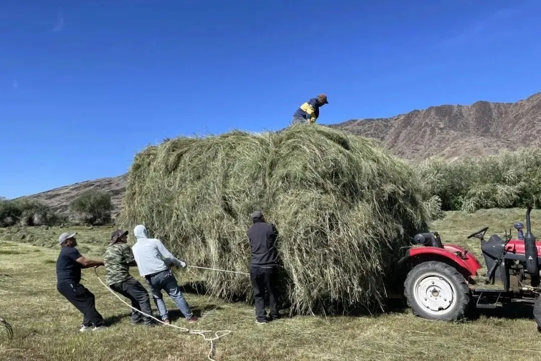 古尔班以放牧为生,养了70只绒山羊、30只绵羊、20头牛和11匹马。2025年8月初,他骑摩托车从夏牧场回到定居点,和家人一起打草,最终收回400包的打草量,于是决定等牧草上市后再补充1000包饲草,其中包括400包苜蓿、600包小麦秸秆。需要购买的饲草量,是打草场收成2.5倍。