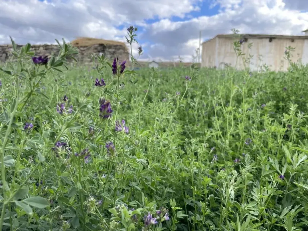 以阿斯卡尔家2024年的牧草种植情况为例,他们家有20亩生长自然杂草的打草场、10亩紫花苜蓿。采用费用低的滴管浇灌,水费1650.5元;打草时,机器收割30亩一共900元;购买苜蓿种子30公斤,每公斤60元,花了1800元(注:苜蓿种子每3-4年买一次);苜蓿种下后第一年收成一共160个方包,打包费480元。算下来,从种植到收成,成本已经超过4800元。