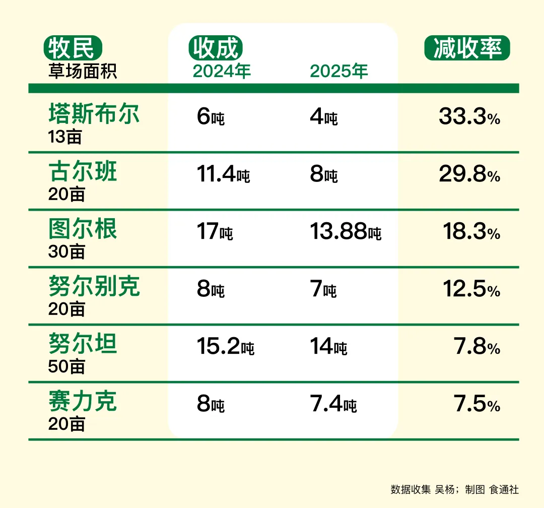 不过牧草减收的情况不是绝对的。阿斯卡尔家的20亩打草场,2025年和2024年都收获了3车的草,大约6吨左右。阿克努尔家的19亩则从5吨增加到8吨,她猜测主要是因为其中一块面积比较大的打草场比去年多浇了几次水。