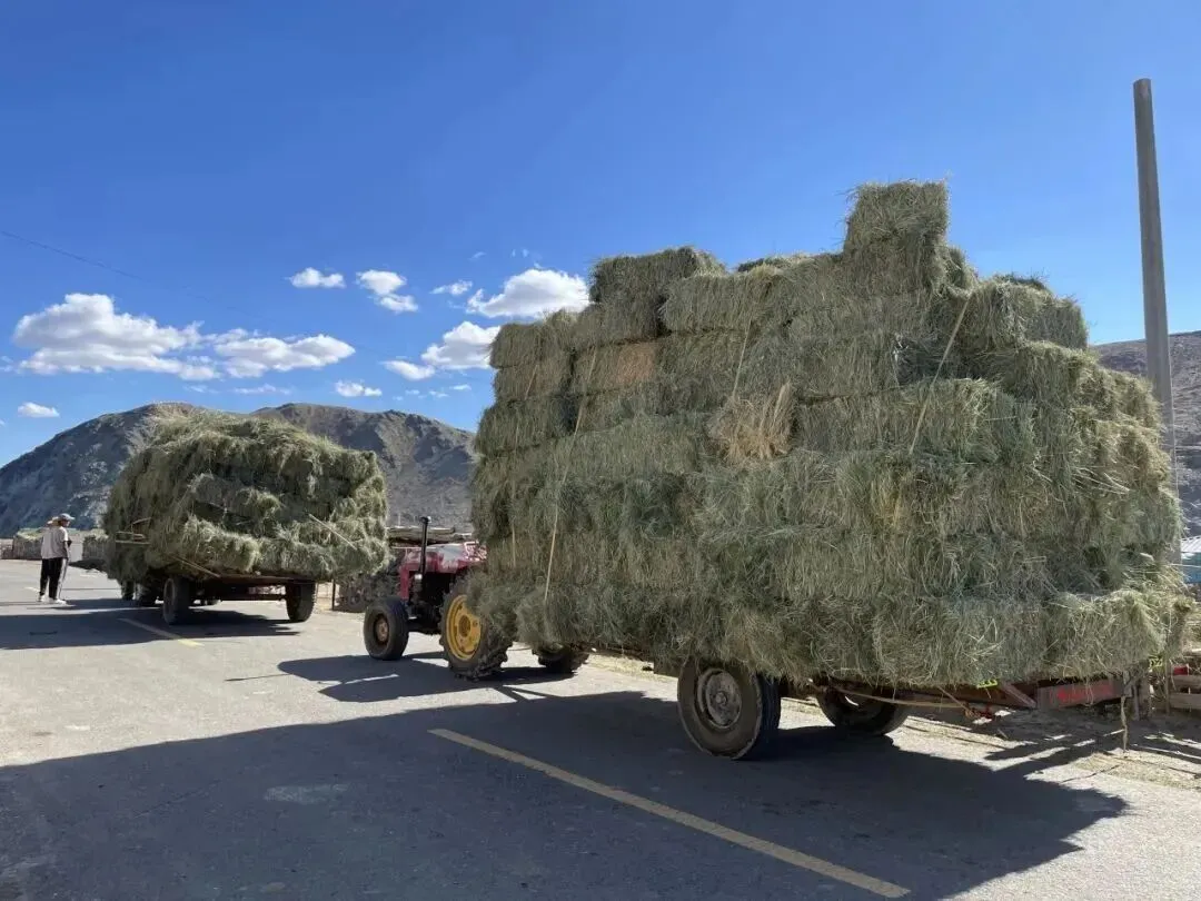 拖拉机载着打好的草运回牧民家