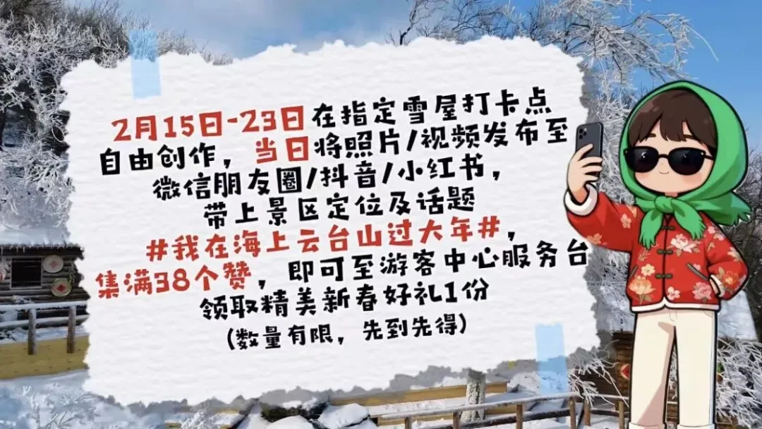 STEP 2:发布至社交平台:将至少3张云顶雪屋打卡照 + 集齐的6张卡合影,发布至朋友圈/抖音/小红书任一平台,添加指定文案:我在海上云台山参与“云顶雪屋 新春有礼”活动啦!并添加景区定位。