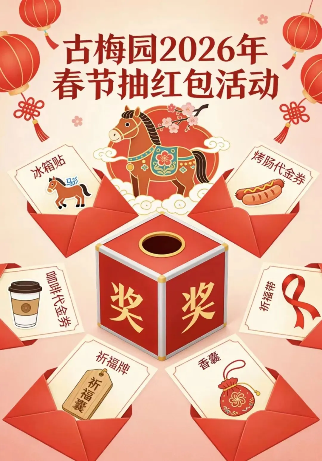 购票即可参与抽红包活动,烤肠、奶茶、福满香囊、咖啡、老神树冰箱贴、福气素面等超多好礼等你来抽,100% 中奖,让你接满新年祝福,欢喜出发!