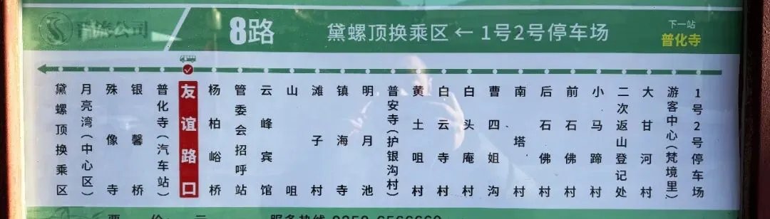 途经站点:游客中心、小马蹄村、前石佛村、后石佛村、南塔村、曹四姐村、白头庵村、白云寺村、黄土咀村、普庵寺(护银沟)、明月池、镇海寺、山咀、云峰宾馆、杨柏峪村、友谊路口、普化寺(汽车站)、明清街、殊像寺、月亮湾、黛螺顶换乘区。