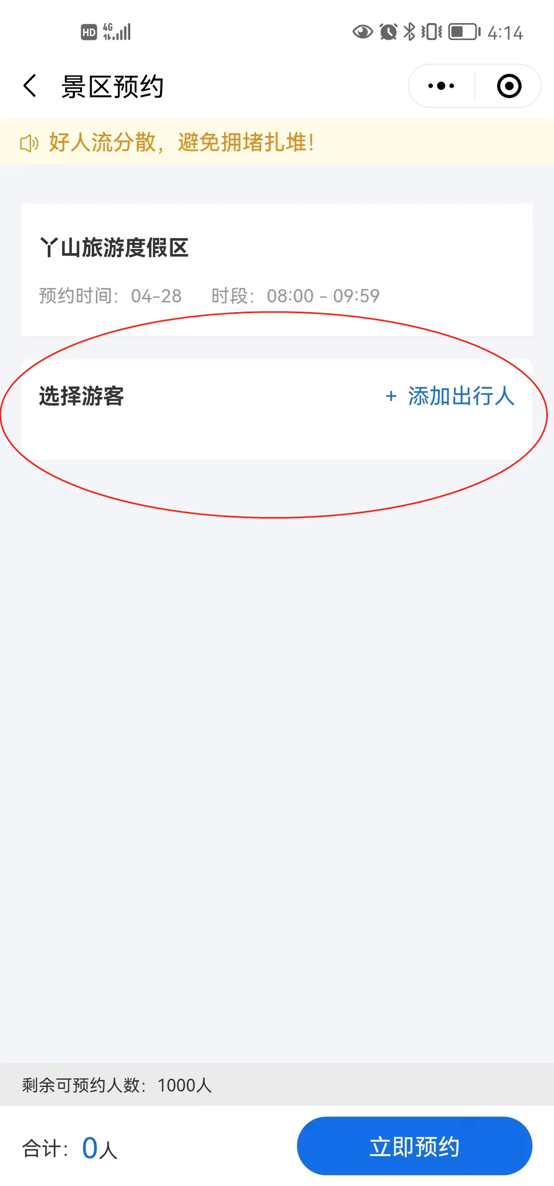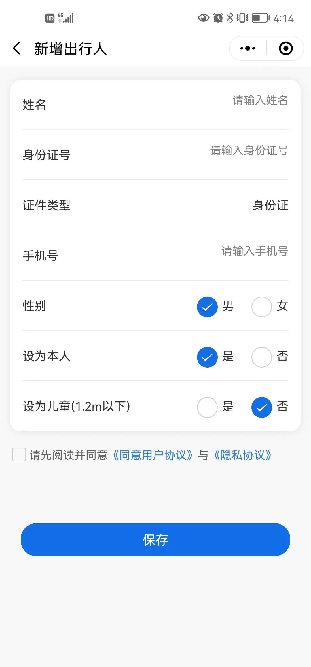 ③点击添加出行人,选择出行人,如需新增出行人,点击新增出行人,输入出行人信息,并点击保存,立即预约。