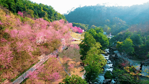 春节临近,景区各主干道已悬挂红灯笼,年味十足。西线四季花谷内2000株福建山樱花与吉野樱正值盛放,西门外约15亩独特的粉白油菜花海也已初绽,预计春节假期全面盛开,形成双色花海景观。