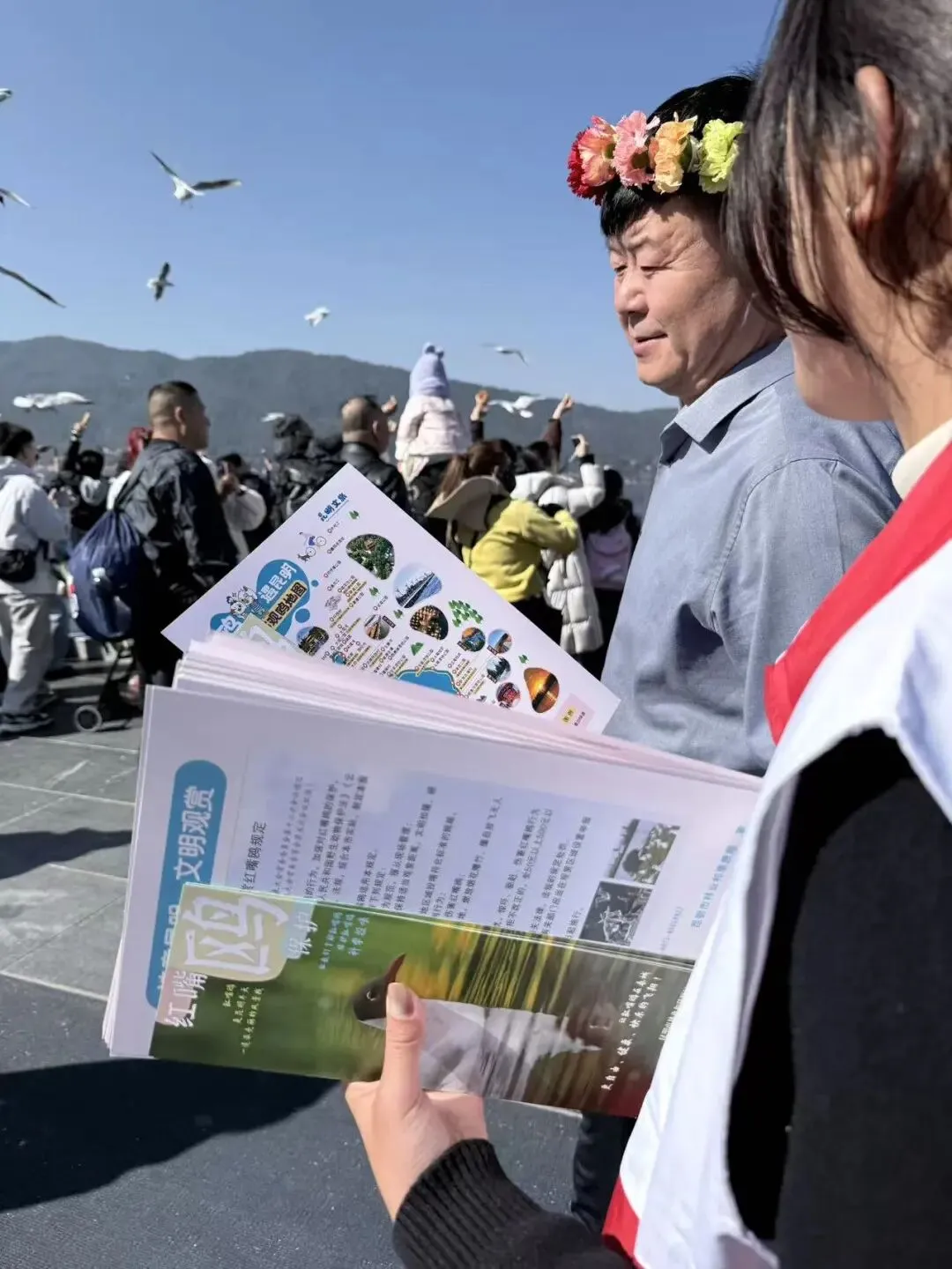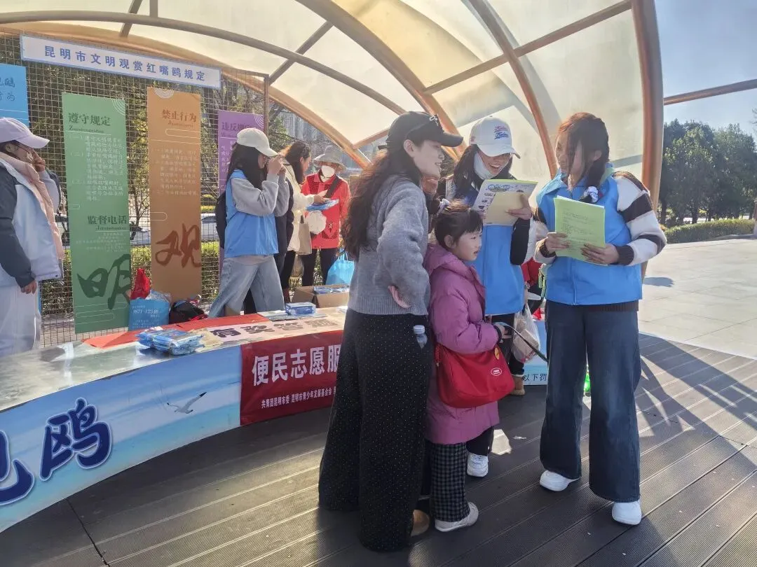 “您好,请使用专用鸥粮,不要投喂面包哦!”志愿者们耐心向游客讲解科学喂鸥知识,引导大家文明观鸥、爱护红嘴鸥,成为海埂大坝上最亲切的“文明解说员”。