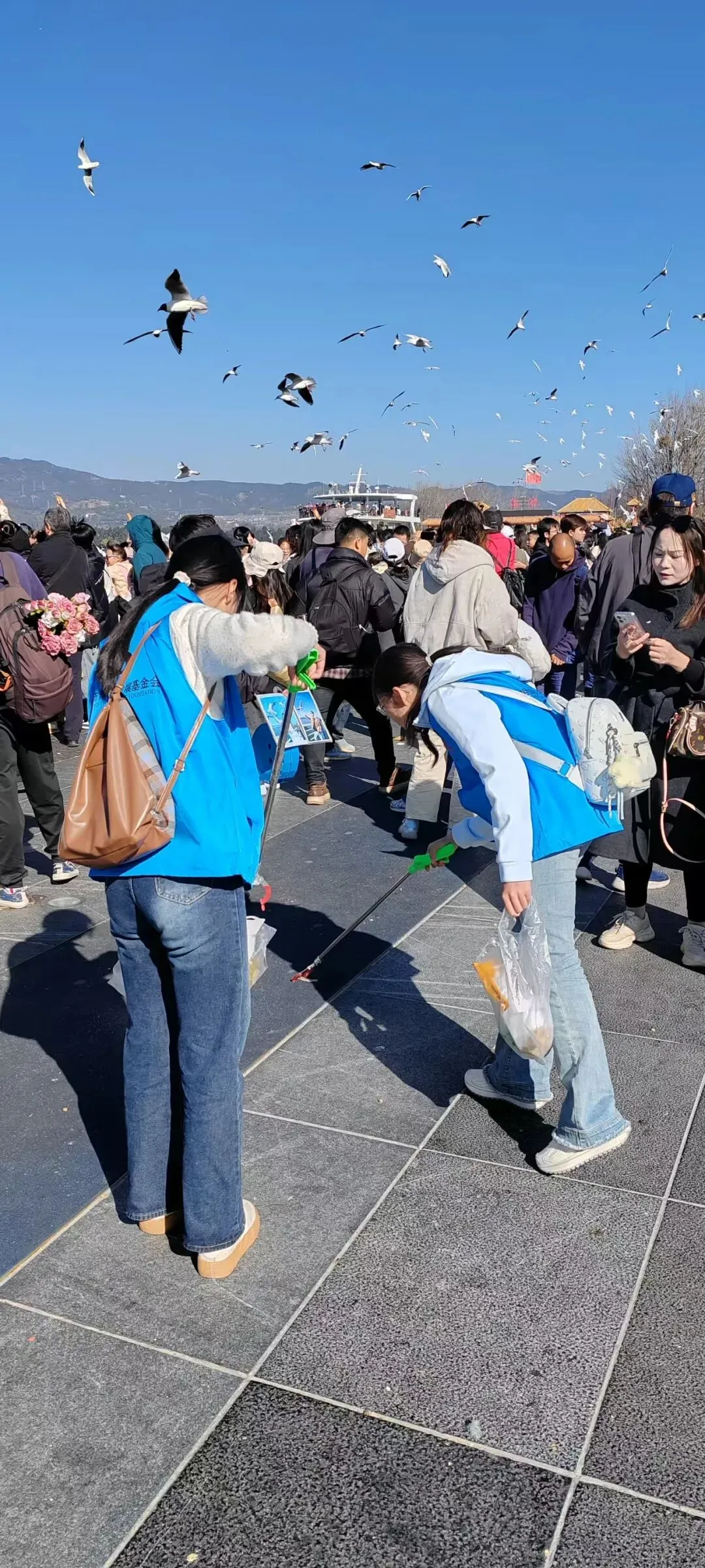 手持垃圾袋和清洁工具的志愿者们,穿梭在人群与绿地之间,细心捡拾垃圾,保持环境整洁。他们的身影,成为大坝上一道流动的风景。
