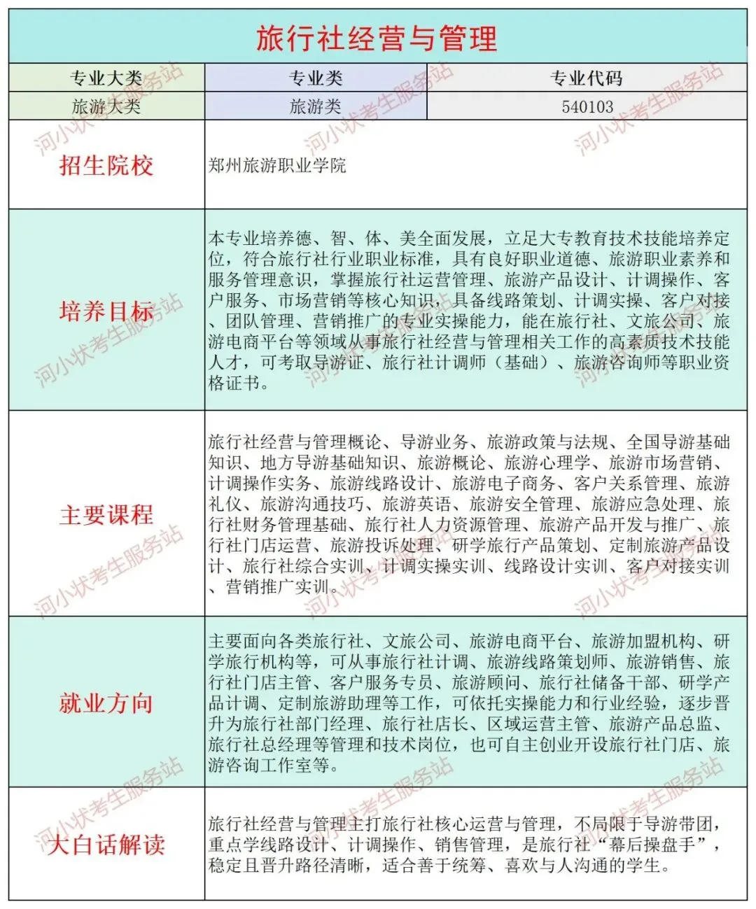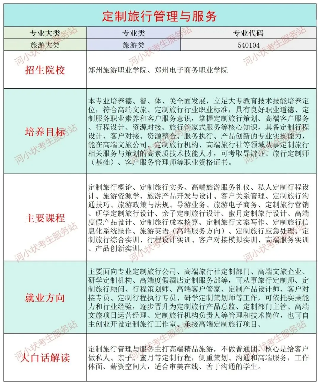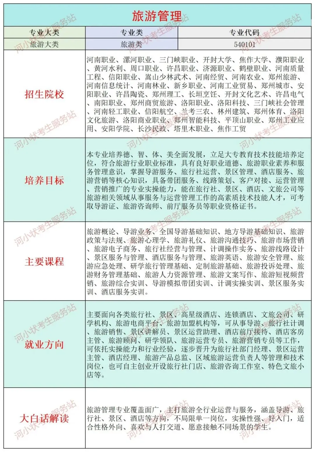 您现在的位置是:首页 > 国内旅游目的推荐 > 正文 国内旅游目的推荐 河南单招【热门专业】解析|旅游类! admin2026年02月10日 21:57:40国内旅游目的推荐11 河南单招【热门专业】解析|旅游类!结合往年各专业报考热度,今天整理了以下相关热门专业,小编从各专业从属专业大类、专业类、专业代码、25年招生院校、专业培养目标、主要学习课程以及毕业就业方向这几个方面为各专业进行详细解析。(备注:专业热度不代表专业好坏,仅从报考热度客观整理)。旅游管理导游旅行社经营与管理定制旅行管理与服务研学旅行管理与服务酒店管理与数字化运营责编 | 李文杰来源 | 网络声明:本文由“河小状考生服务站”公众号综合整理自网络,是出于传递具有良好价值信息,如有侵权,请及时联系我们,我们将根据著作权人的要求,立即更正或者删除有关内容。如果觉得本文有用,欢迎转发!推荐阅读洛阳单招培训班开课!邻地铁口!转发!河南单招招生专业汇总及各专业对应招生院校统计表!转发!2026年河南省单招考试全流程、时间节点及注意事项!2025年河南单招 | 各学校考核方式、考试内容、招生人数、录取规则汇总【最全版】 转载请说明来源于"旅荐网",部分内容转载自网络,如有侵权请联系qlwl@foxmail.com删除 本文地址:https://www.15386.cn/post/100740.html 上一篇 我是做旅游的,他们是搞诈骗的! 下一篇 兴化市旅游市场强制消费问题典型案例 相关文章 国梦九州(北京)旅游规划设计院院长王昕、副院长霍红蕾以及《水上运动》编辑近日赴湖北省恩施州鹤峰县考察 峨眉山旅游攻略,轻松游玩不迷路! 北京-武汉周末旅游攻略 打工人必看! 外国人去西藏林芝桃花节旅游攻略8日 贵州旅游攻略分享,贵州旅游必去景点及5天4夜行程速览 中国天眼景区旅游攻略 2026三亚旅游攻略|纯玩不踩坑,选海南独角兽旅行社就对了 教学能力大赛比赛教案和实施报告:旅游大类导游业务《景区导游带团实务》管理专业,那堂课,惊艳全场! 2026全国重点城市旅游包车服务深度报告 韩国景点攻略!本地人整理超详细~ 发表评论 取消回复 评论列表 这篇文章还没有收到评论,赶紧来抢沙发吧~