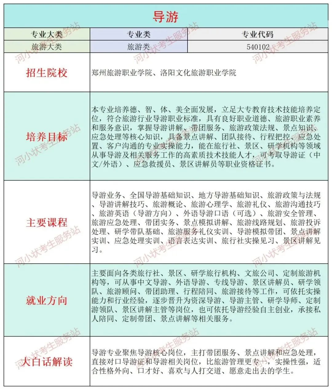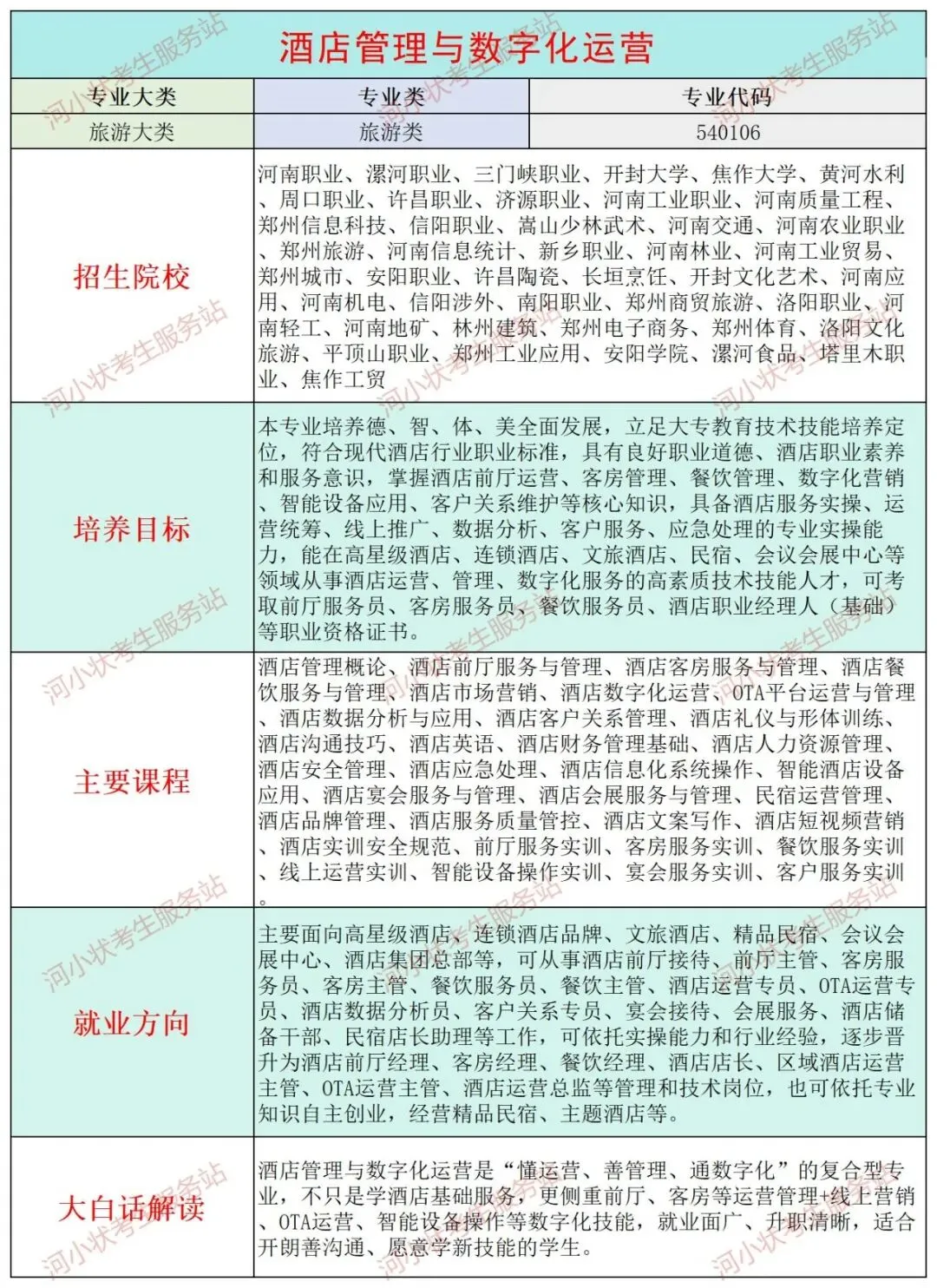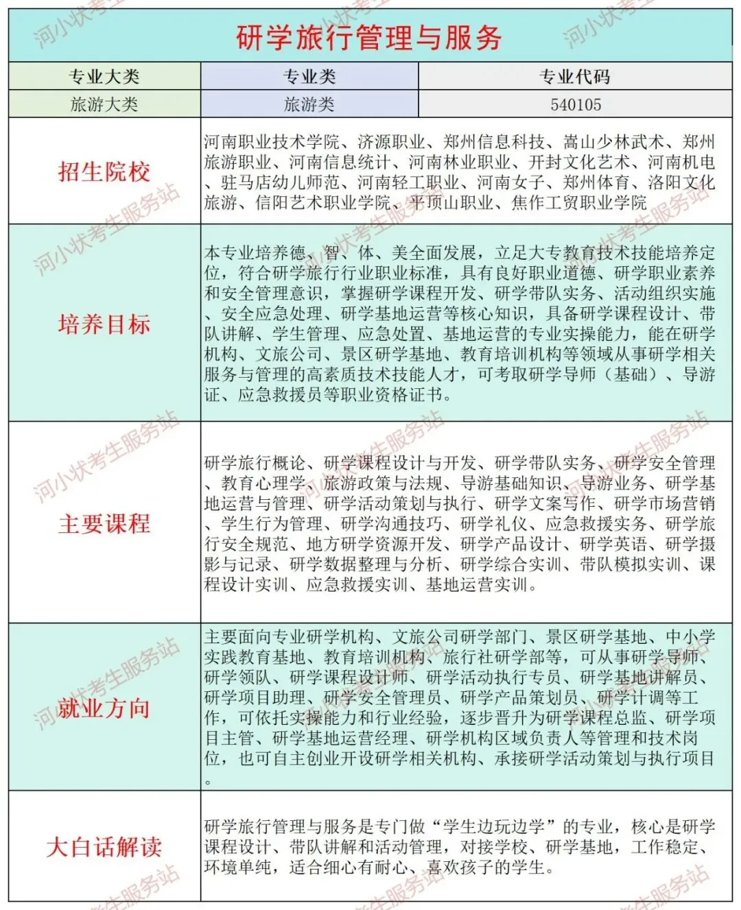 您现在的位置是:首页 > 国内旅游目的推荐 > 正文 国内旅游目的推荐 河南单招【热门专业】解析|旅游类! admin2026年02月10日 21:57:40国内旅游目的推荐11 河南单招【热门专业】解析|旅游类!结合往年各专业报考热度,今天整理了以下相关热门专业,小编从各专业从属专业大类、专业类、专业代码、25年招生院校、专业培养目标、主要学习课程以及毕业就业方向这几个方面为各专业进行详细解析。(备注:专业热度不代表专业好坏,仅从报考热度客观整理)。旅游管理导游旅行社经营与管理定制旅行管理与服务研学旅行管理与服务酒店管理与数字化运营责编 | 李文杰来源 | 网络声明:本文由“河小状考生服务站”公众号综合整理自网络,是出于传递具有良好价值信息,如有侵权,请及时联系我们,我们将根据著作权人的要求,立即更正或者删除有关内容。如果觉得本文有用,欢迎转发!推荐阅读洛阳单招培训班开课!邻地铁口!转发!河南单招招生专业汇总及各专业对应招生院校统计表!转发!2026年河南省单招考试全流程、时间节点及注意事项!2025年河南单招 | 各学校考核方式、考试内容、招生人数、录取规则汇总【最全版】 转载请说明来源于"旅荐网",部分内容转载自网络,如有侵权请联系qlwl@foxmail.com删除 本文地址:https://www.15386.cn/post/100740.html 上一篇 我是做旅游的,他们是搞诈骗的! 下一篇 兴化市旅游市场强制消费问题典型案例 相关文章 国梦九州(北京)旅游规划设计院院长王昕、副院长霍红蕾以及《水上运动》编辑近日赴湖北省恩施州鹤峰县考察 峨眉山旅游攻略,轻松游玩不迷路! 北京-武汉周末旅游攻略 打工人必看! 外国人去西藏林芝桃花节旅游攻略8日 贵州旅游攻略分享,贵州旅游必去景点及5天4夜行程速览 中国天眼景区旅游攻略 2026三亚旅游攻略|纯玩不踩坑,选海南独角兽旅行社就对了 教学能力大赛比赛教案和实施报告:旅游大类导游业务《景区导游带团实务》管理专业,那堂课,惊艳全场! 2026全国重点城市旅游包车服务深度报告 韩国景点攻略!本地人整理超详细~ 发表评论 取消回复 评论列表 这篇文章还没有收到评论,赶紧来抢沙发吧~