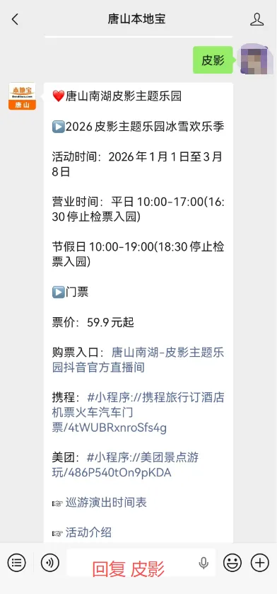 备注:点击下方名片,关注【唐山本地宝】微信公众号,聊天框回复【皮影】获取皮影乐园门票购票入口(本地宝不售票,只做官方售票渠道汇总)
