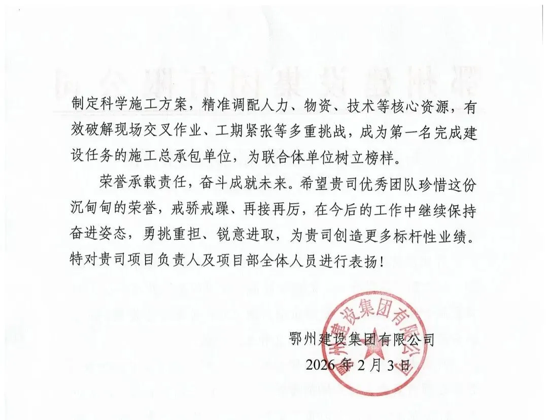 这封表扬函既是对项目团队工作的充分肯定,也是对湖北工建综合实力的高度认可。业主方的满意评价将进一步激励全体人员保持优良作风,在未来的工程建设中持续追求更高标准,打造更多精品项目,不断提升企业品牌影响力和市场竞争力。