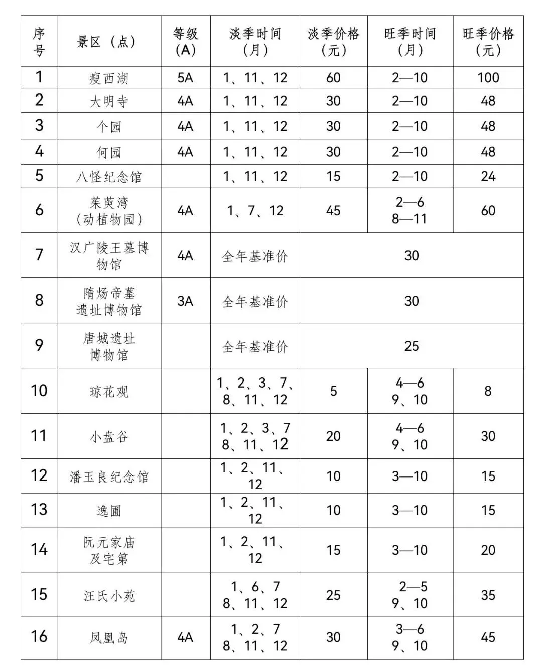 汉广陵王墓博物馆、隋炀帝墓遗址博物馆、唐城遗址博物馆,全年实行基准价,票价分别为30元、30元、25元;