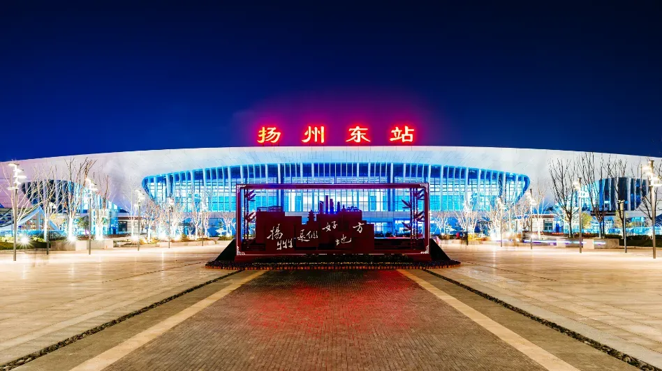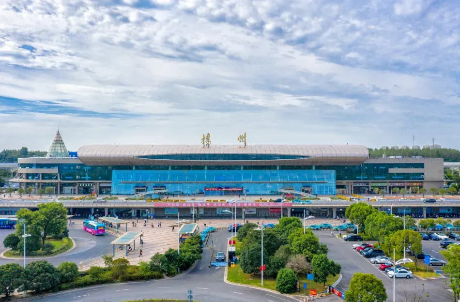 扬州站位于江苏省扬州市邗江区。车站整体设计体现以人为本的设计理念,主体建筑坐北朝南,高架桥上下分设车道,车辆与行人分开,实行铁路、公路近距离换乘。车站建筑外墙以浅蓝色和香槟色为主调,造型现代,整体协调,凭其建筑特色,荣获“鲁班奖”。