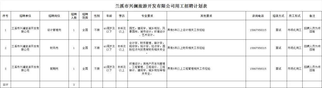 详见附件《兰溪市兴澜旅游开发有限公司用工招聘计划表》(年龄、户籍和工作经历截止到公告之日)。