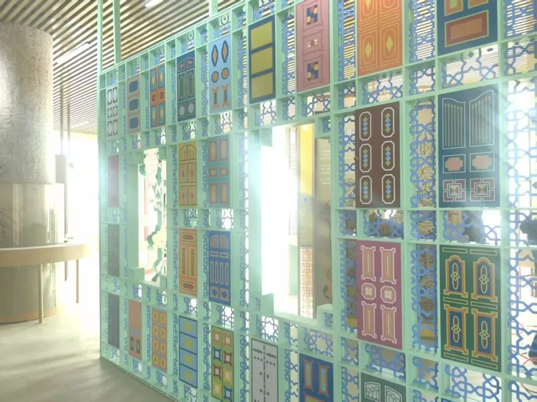 中心大门右手边则是一面以艾得莱斯绸经典纹样为底色的互动墙面,这将成为游客们的“探秘乐园”。这种被誉为“丝路活化石”的传统织物,将巴旦木、石榴等吉祥图案化作墙面装饰,而这些图案背后,藏着通往知识的“秘密机关”——每一个纹样都是一扇精巧的小门,每扇门后都藏着“知识宝藏”,有的是人文趣事,有的是沙生植物的生长奥秘,有的是丝路古道的岁月故事,每一次探索都充满未知与惊喜。