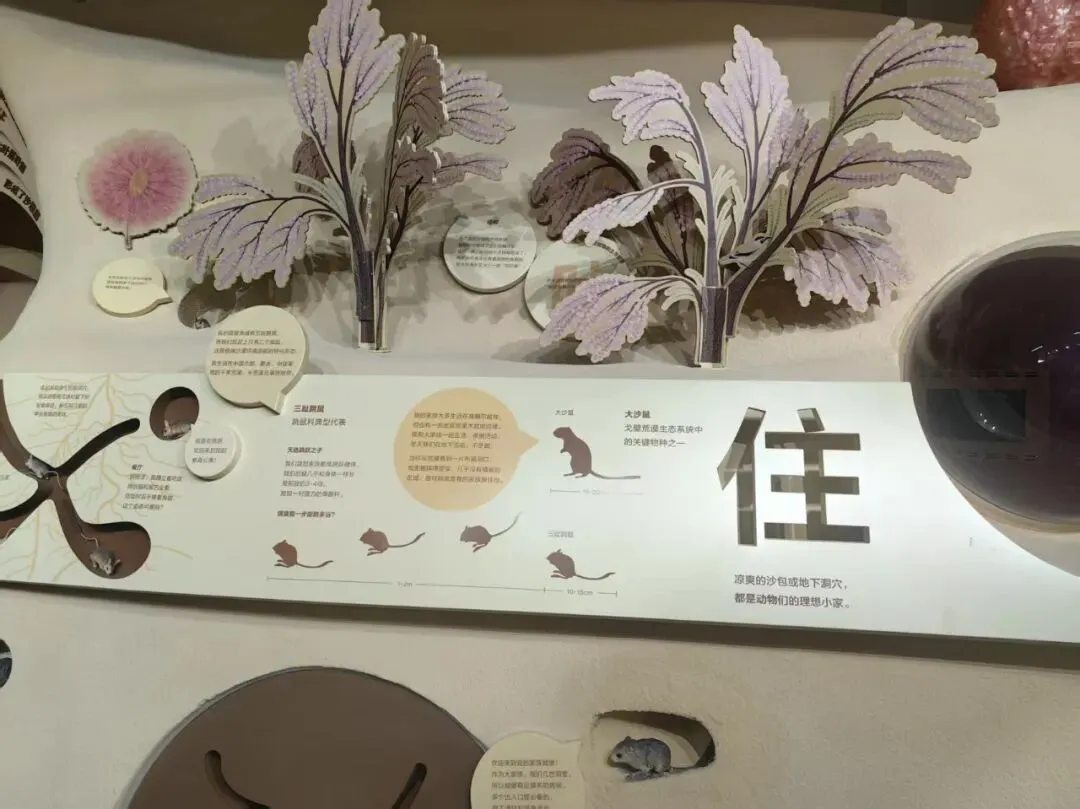 穿过织锦墙面,踏入“沙漠生灵探秘长廊”。这里没有传统动物园的玻璃阻隔,只有模拟沙漠地貌的仿真场景,耳畔是环绕式的虫鸣与鸟鸣,仿佛真正闯入塔克拉玛干的腹地。仿真沙丘上,沙蜥、跳鼠等动态仿真模型藏在灌丛之中,轻轻触碰便会灵活“窜动”,营造出“身临其境”的探险氛围。