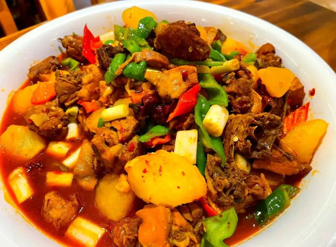 晚上大盘鸡上桌,配宽面一窝,汁一裹,筷子不肯停。