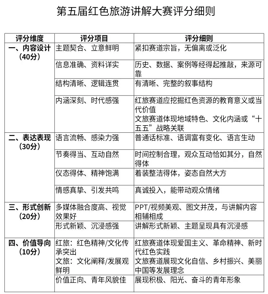 为深入贯彻落实国家“十五五”规划关于“推进旅游强国、文化强国建设”的战略部署,创新传承红色基因,生动推介祖国大地的自然之美、人文之韵与发展之果,鼓励广大青年学子在实践中锤炼专业本领、厚植家国情怀,经研究,决定在往届红色旅游讲解大赛举办经验的基础上,全面升级赛事,设立“红色旅游讲解”与“文旅推介”双赛道,旨在发掘和培养一批守正创新、敢闯会创的文旅新青年。现将有关事项通知如下: