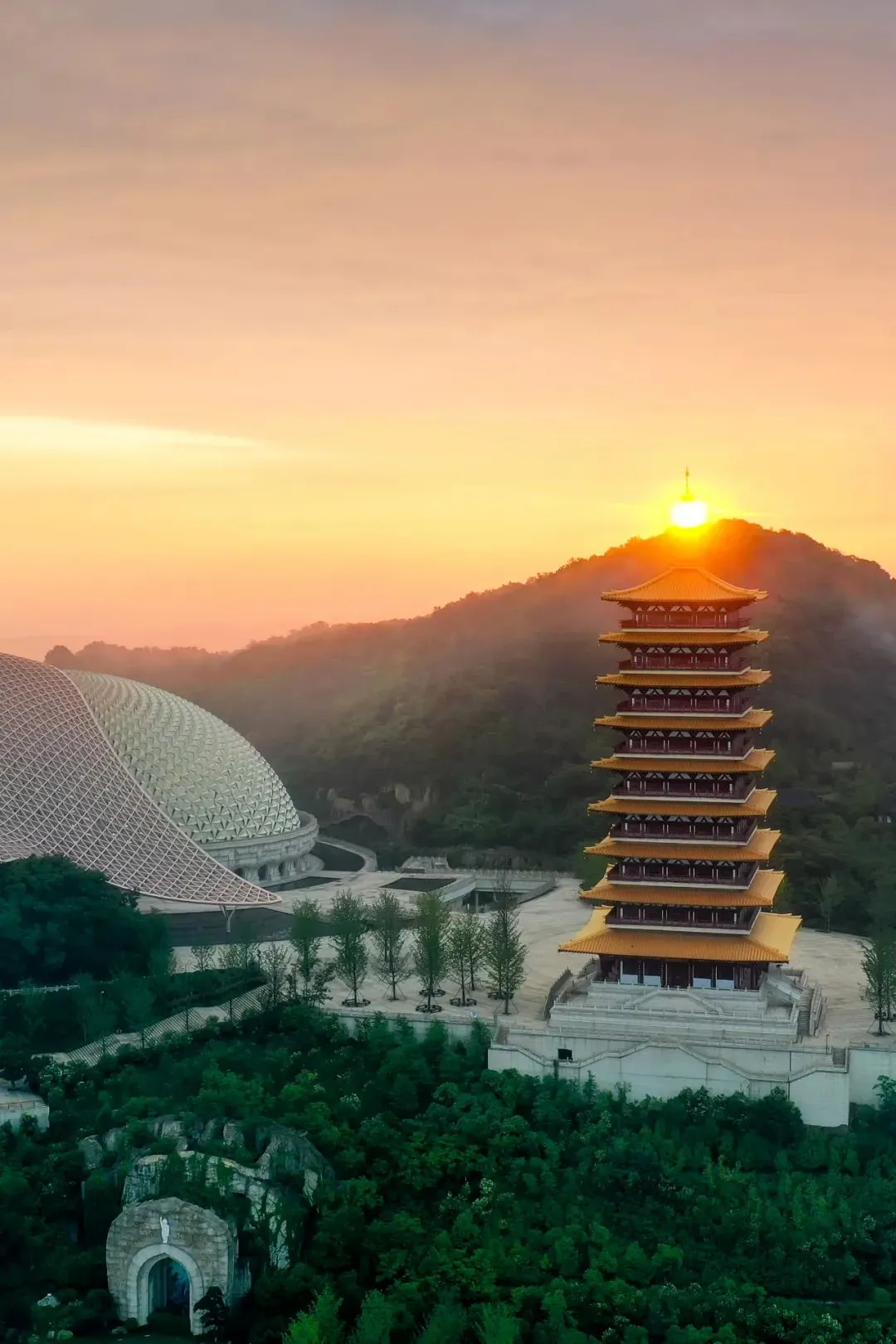 图片by@摄影师张明 国内首个建在废弃矿坑里的文化名山,秉持着“生态修复、文化修补”的理念,践行“绿水青山就是金山银山”的典范,变废为宝,再现双峰双塔的风采。 小穹顶“金菠萝”,大穹顶覆于“金菠萝”之上,新颖设计,同时荣膺詹天佑奖和鲁班奖。 世界级震撼景观,名不虚传。