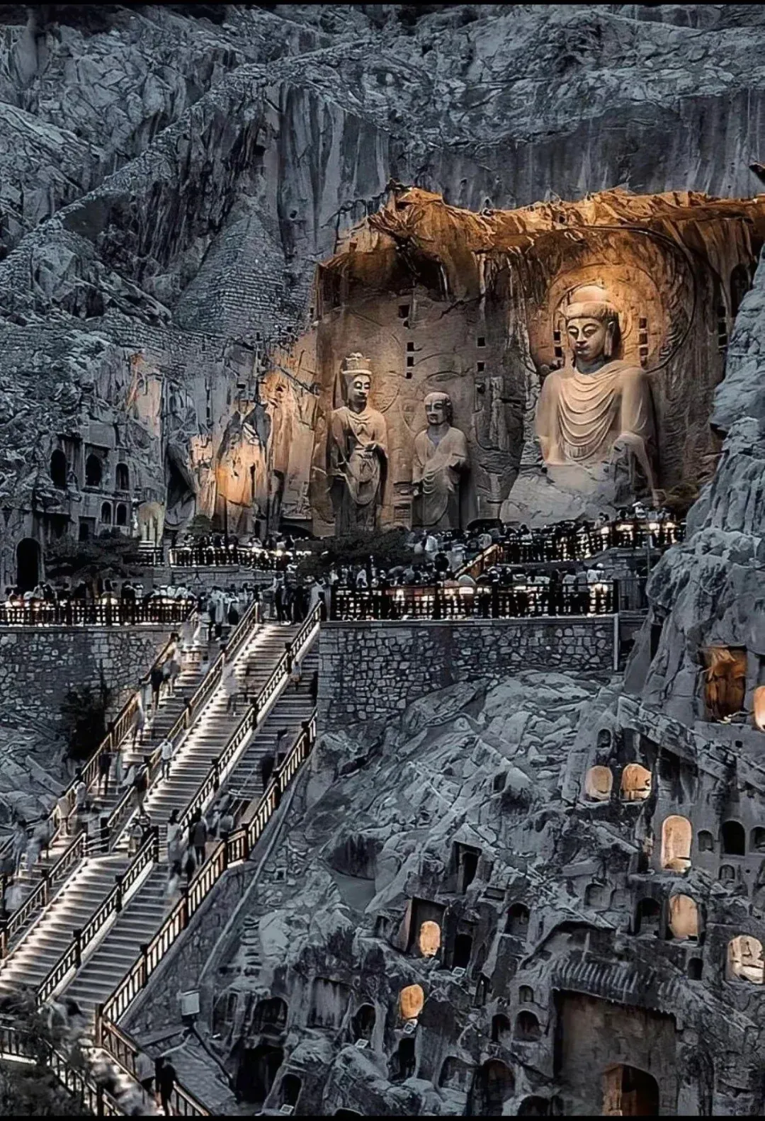 伊河两岸的山崖上,镌刻着千年的信仰。这座 5A 景区不同于莫高窟的戈壁秘境,它依水而建,十万余尊佛像错落分布在龙门山与香山的崖壁上。站在奉先寺下,仰望卢舍那大佛的慈祥面容,阳光穿过伊河的水汽洒在佛龛上,仿佛穿越千年与古人对话。夜游龙门更具氛围感,灯光勾勒出佛像的轮廓,晚风里都是历史的厚重。