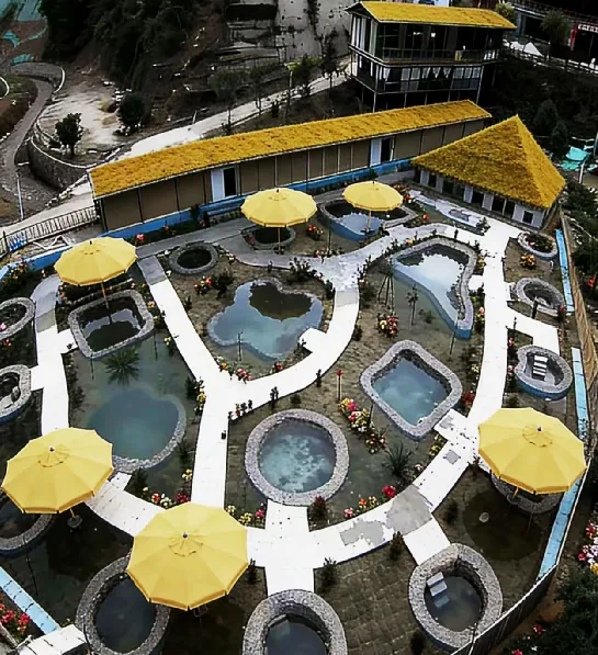 在瀑布与山林环抱之中,享受天然温泉的惬意。