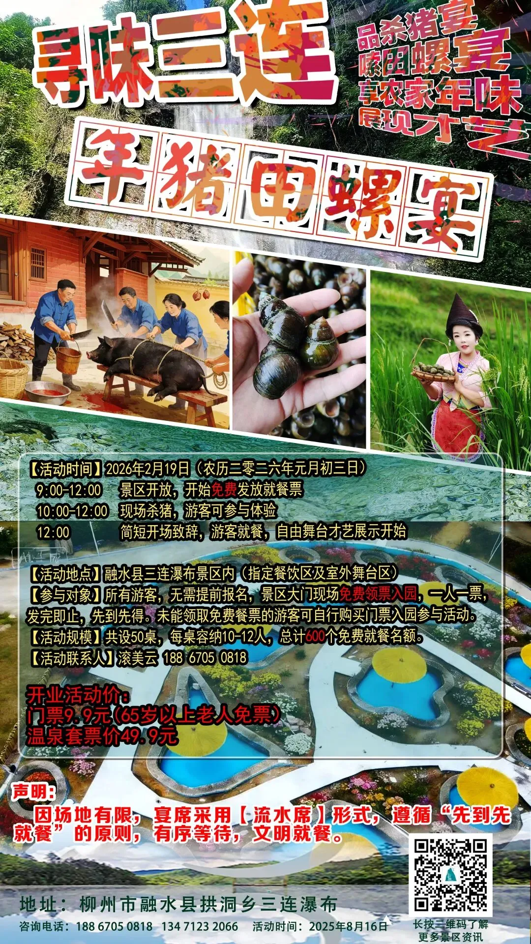 经过数月的精心升级,融水县三连瀑布景区即将于2026年2月14日(农历十二月廿七日)焕新开业!这一次,我们不仅保留了原生态的瀑布风光与农家情怀,更全新打造了【山地温泉】,让你在山水之间,暖意融融过新年!