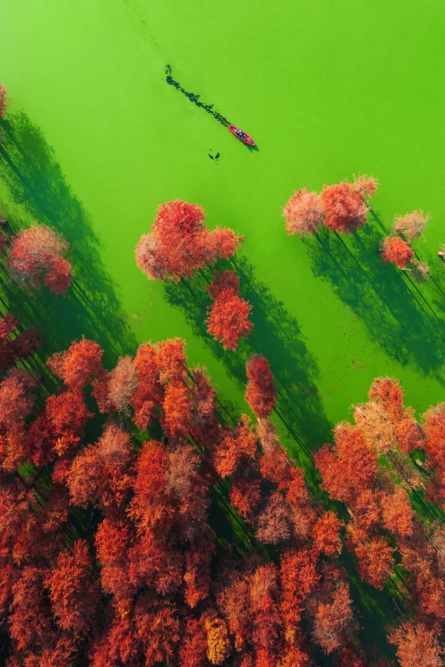 免费木栈道穿梭水杉林,湖面浮萍点缀,春夏翠绿、秋冬红褐;可以步行、骑行,还能沿湖野餐,慢慢逛3小时都不腻。