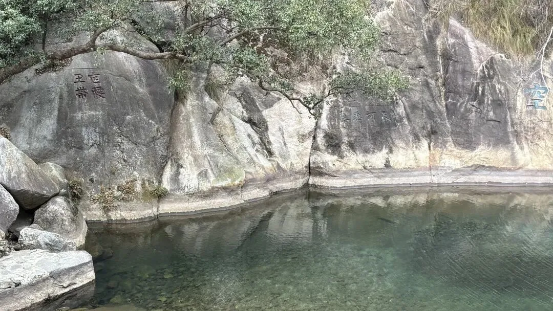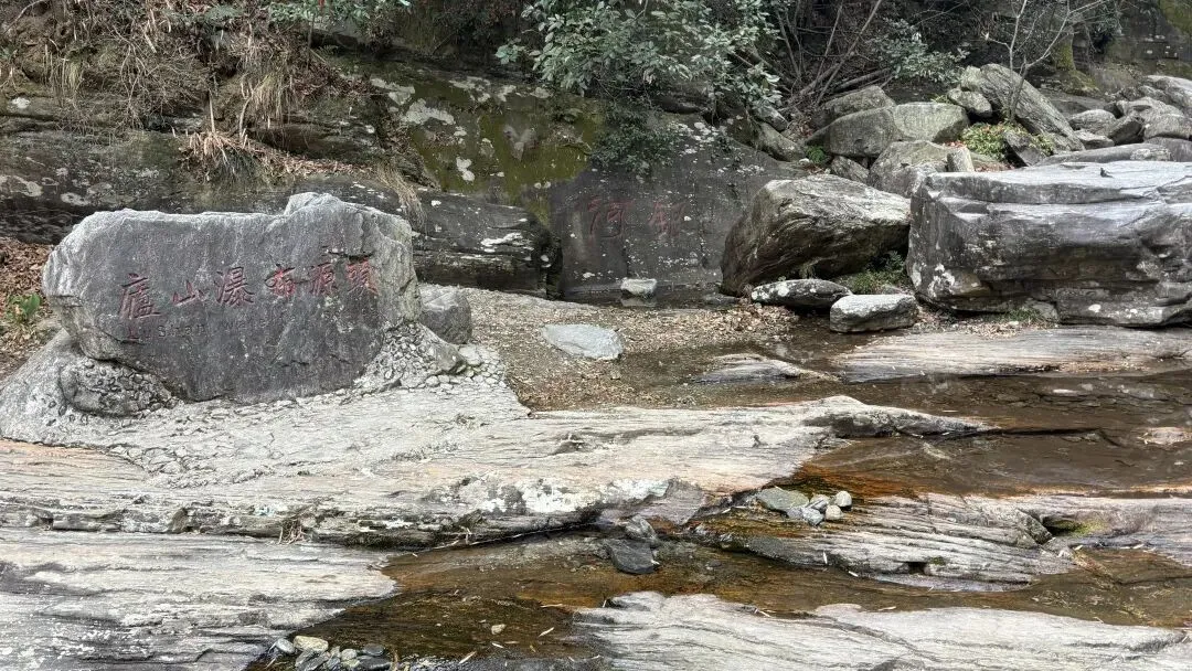 进入秀峰景区,古木参天,西行近百步,乘索道而上,右侧可见马尾、香炉两瀑分列龟背峰左右,正前方高耸云端的即是香炉峰、双剑峰。到上站,过文殊塔,右转拾级而上,约百余米,乃千年古刹黄岩寺,旁有小溪,冬季的小溪细流潺潺,过“银河桥”,复行数百步,有一深潭,正下方就是香炉瀑,当地人又叫黄岩瀑布,盖因在黄岩峰之下。仔细查看,溪畔有一刻石,上书“庐山瀑布之源头”,这便是“庐山瀑布”的来历。