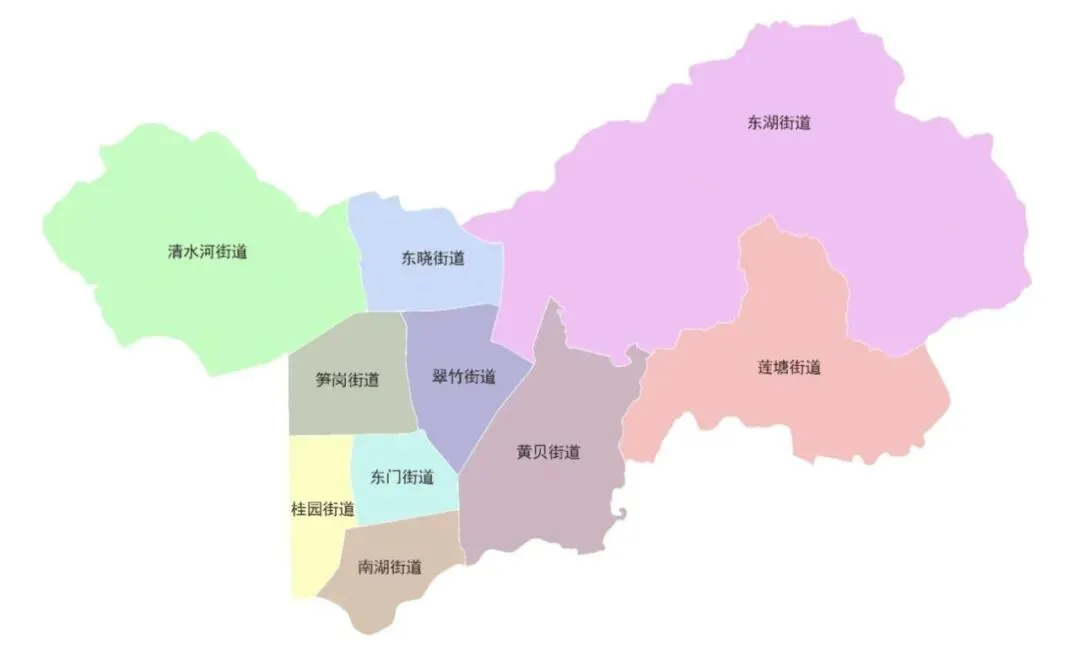 罗湖区辖10个街道:桂园街道、黄贝街道、东门街道、南湖街道、笋岗街道、东湖街道、莲塘街道、东晓街道、清水河街道、翠竹街道,区政府驻文锦中路。