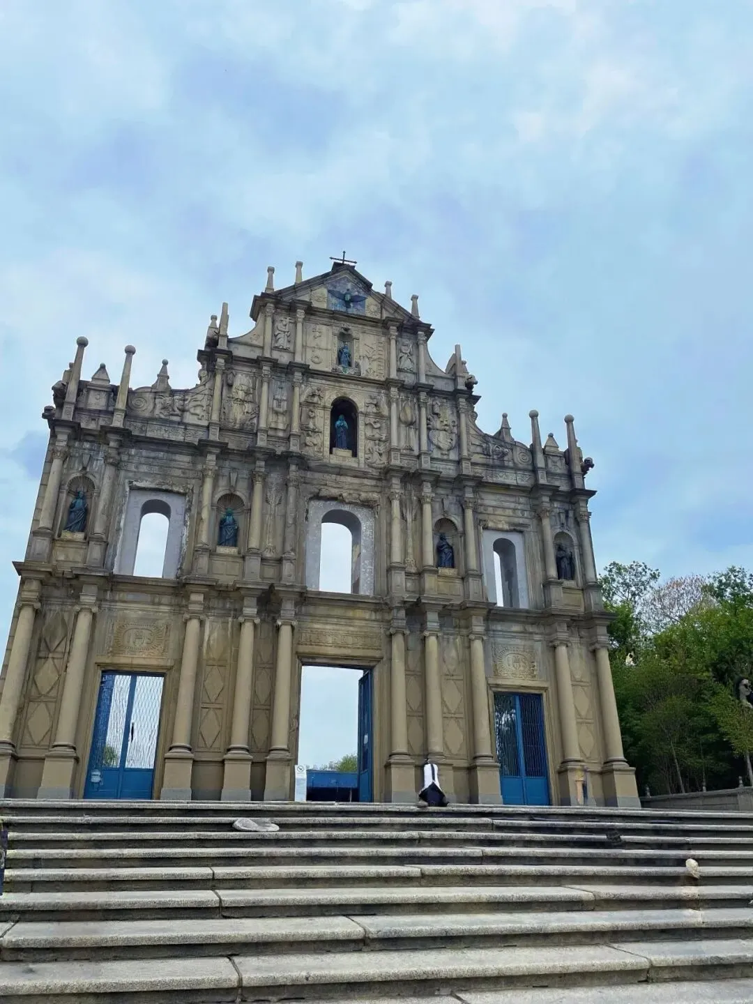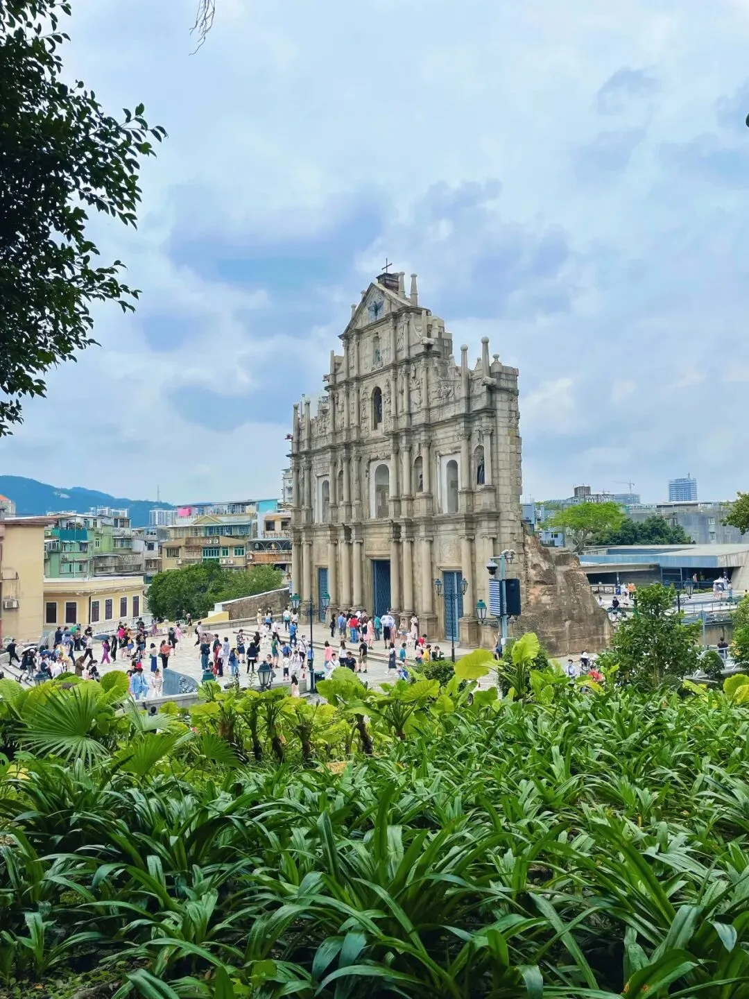 澳门地标,圣保禄大教堂遗址,登顶可俯瞰老城区;旁边有哪吒庙、恋爱巷(彩色葡式建筑,拍照出片)。