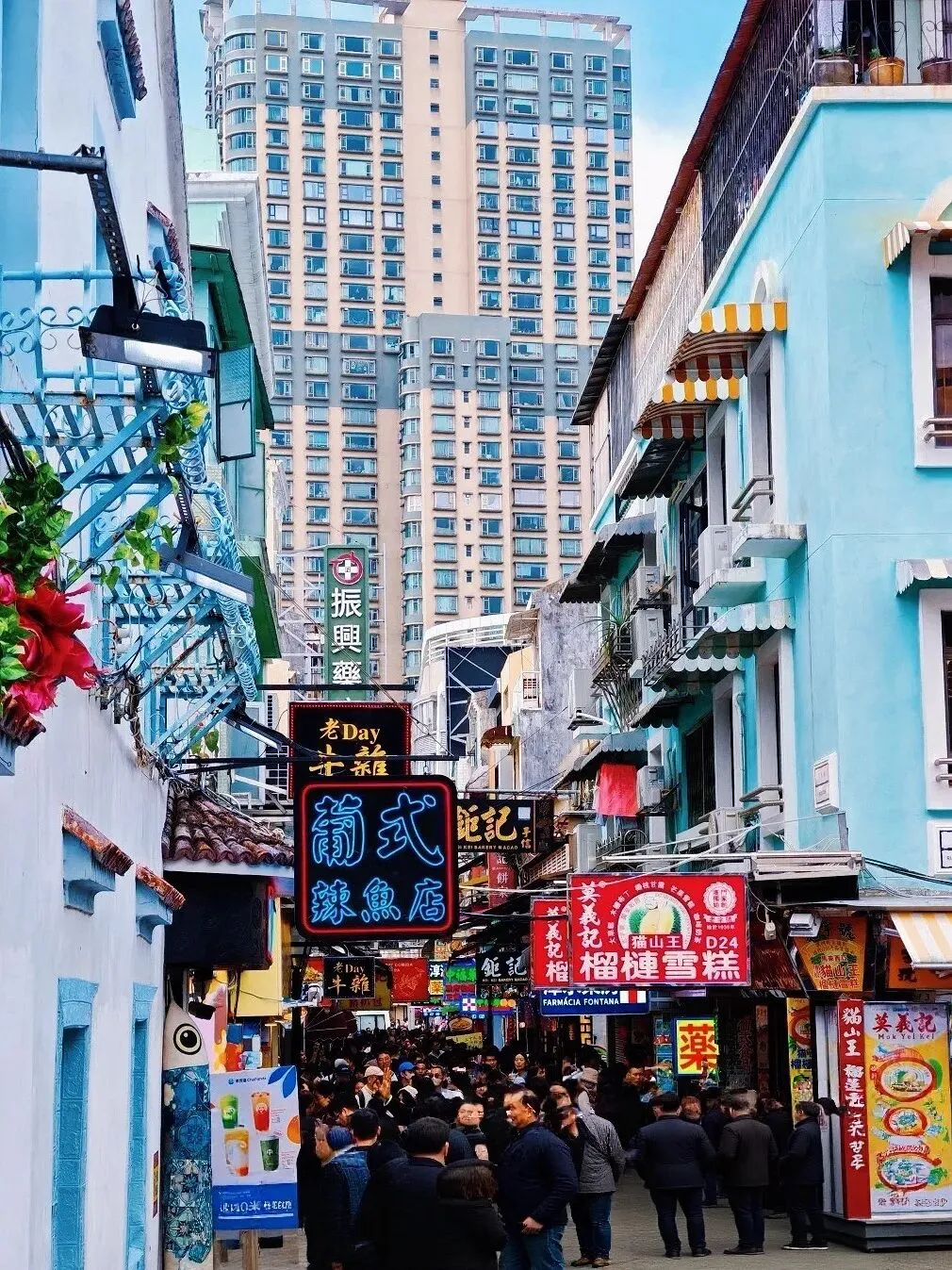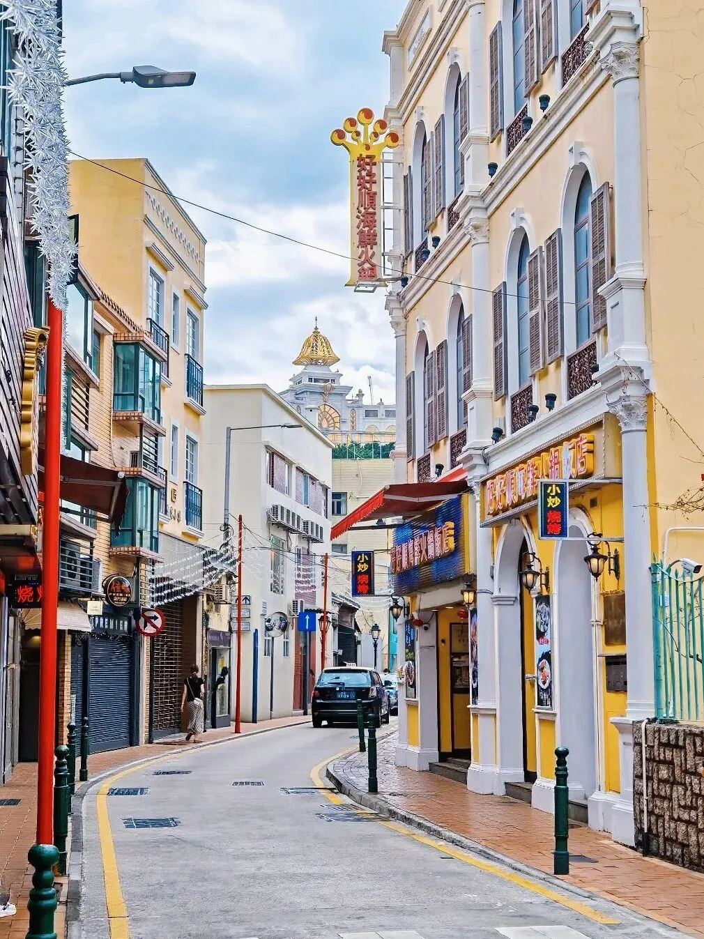 不长但云集葡式蛋挞、猪扒包、水蟹粥、木糠布甸等美食,还有手信店;附近的龙环葡韵住宅式博物馆,是葡式建筑群,适合拍照。