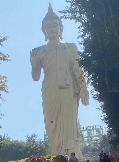 人们虔心面对寺宇和大佛