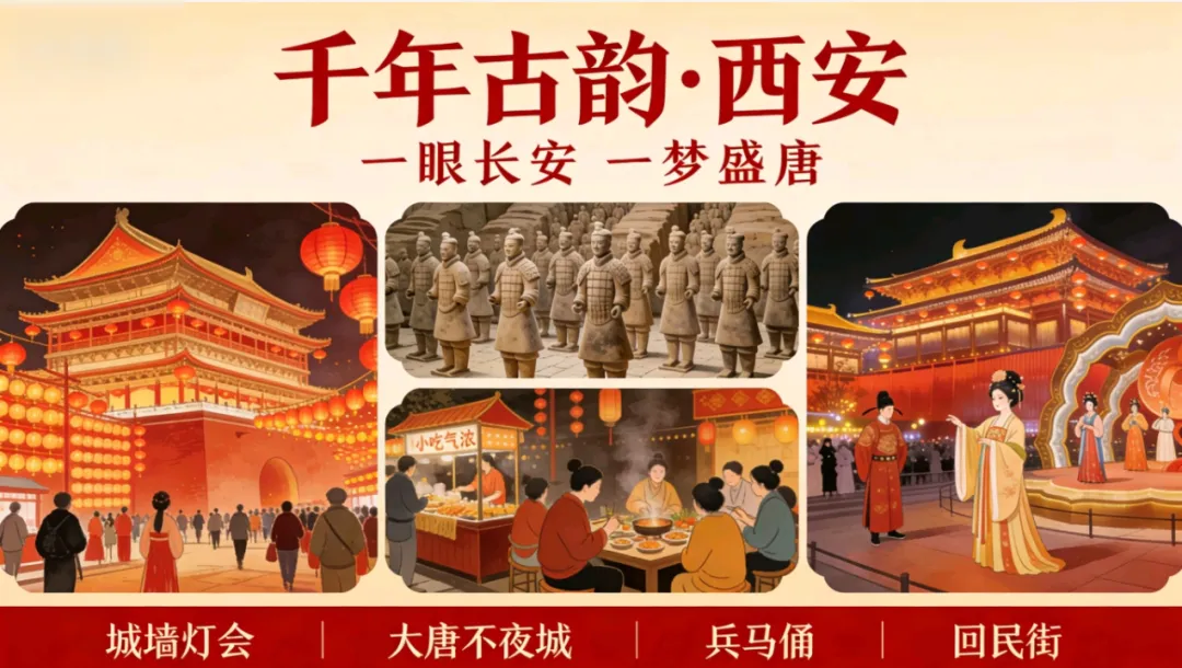 一眼长安,一梦盛唐。城墙灯会、大唐不夜城、兵马俑、回民街,年味与历史撞个满怀,沉浸式感受华夏根脉。