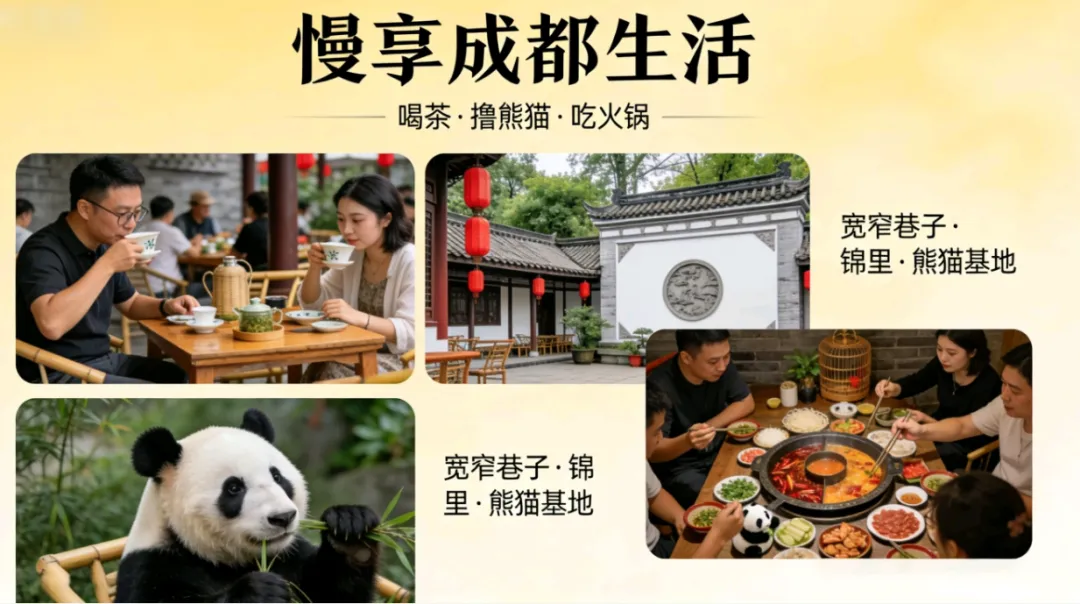 喝茶、撸熊猫、吃火锅,把日子过成慢悠悠的小调。宽窄巷子、锦里、熊猫基地,安逸巴适,治愈所有疲惫。
