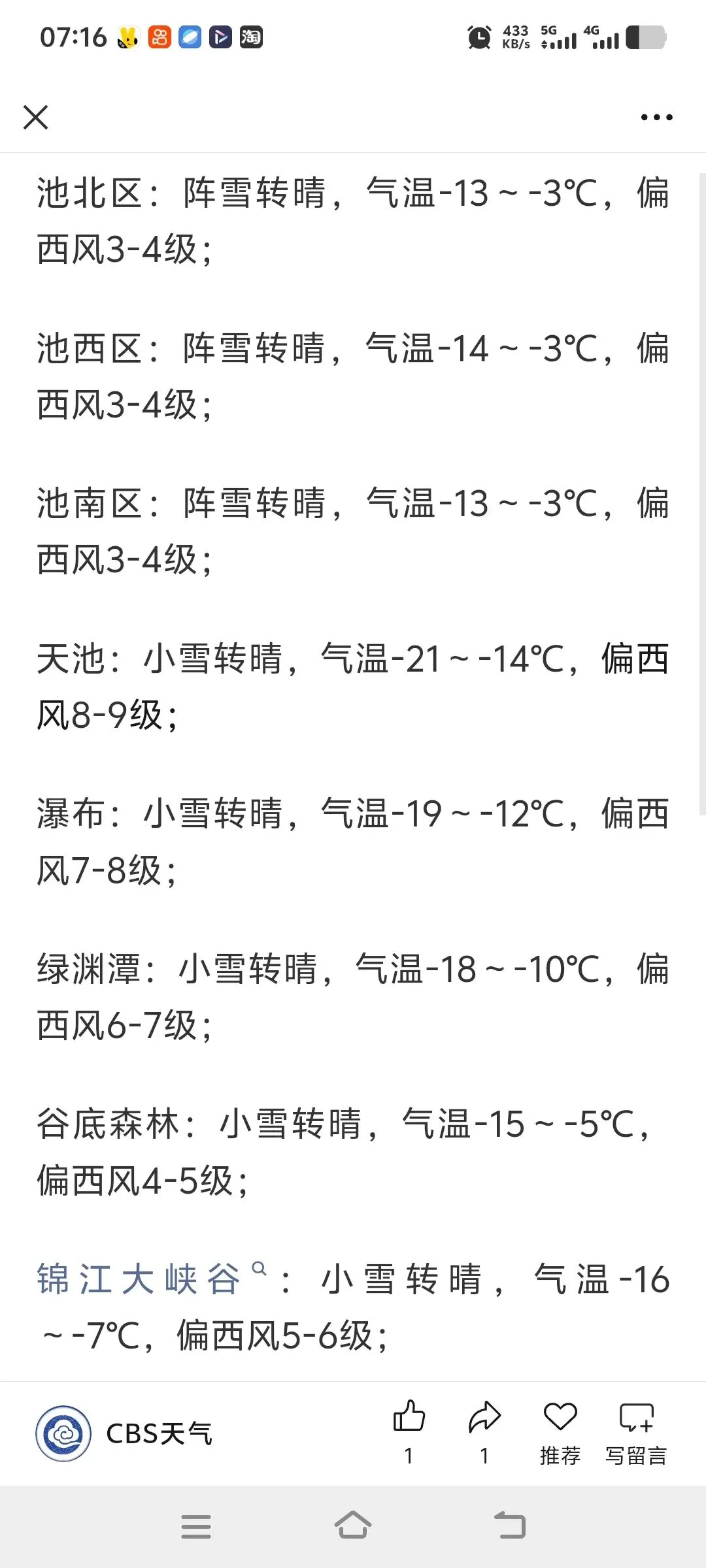 ➡️北景区天池主峰,风力较大,公路、栈道积雪结冰,不具备安全运营条件,天池景点全天关闭。其他景点正常开放,视天气情况随时关闭。 ➡️西景区主峰,风力较大,公路积雪结冰,不具备安全运营条件,天池景点全天关闭。粉雪谷、锦江大峡谷景点,正常开放,视天气情况随时关闭。 ➡️南景区关闭。