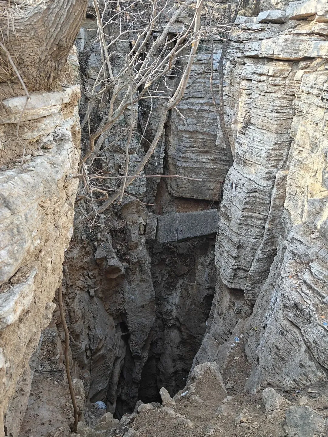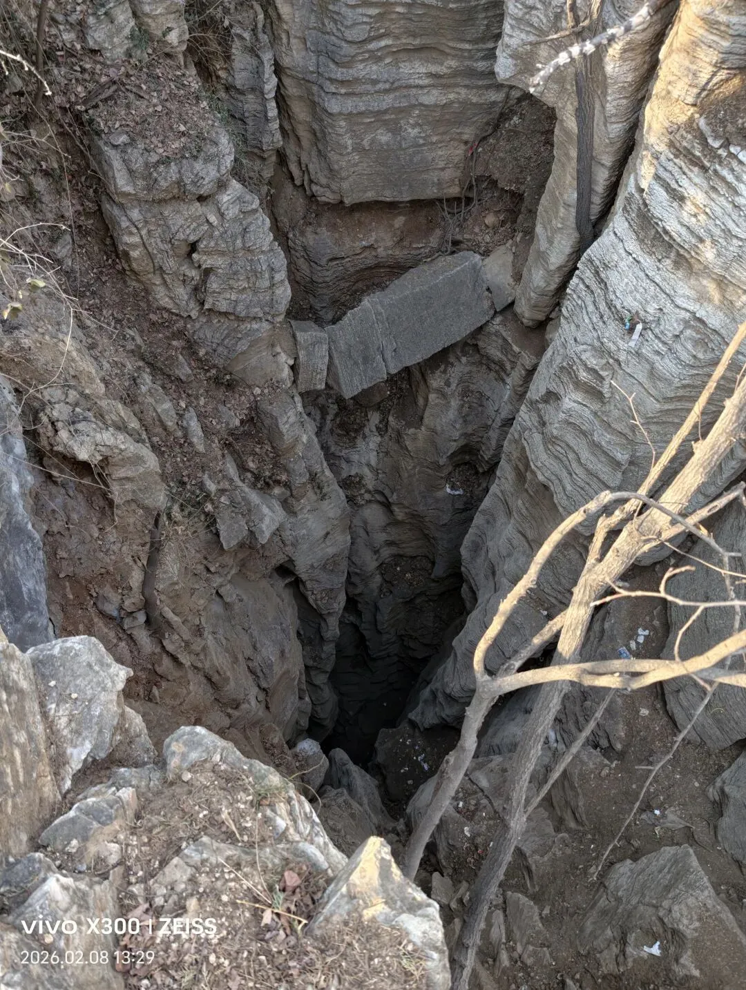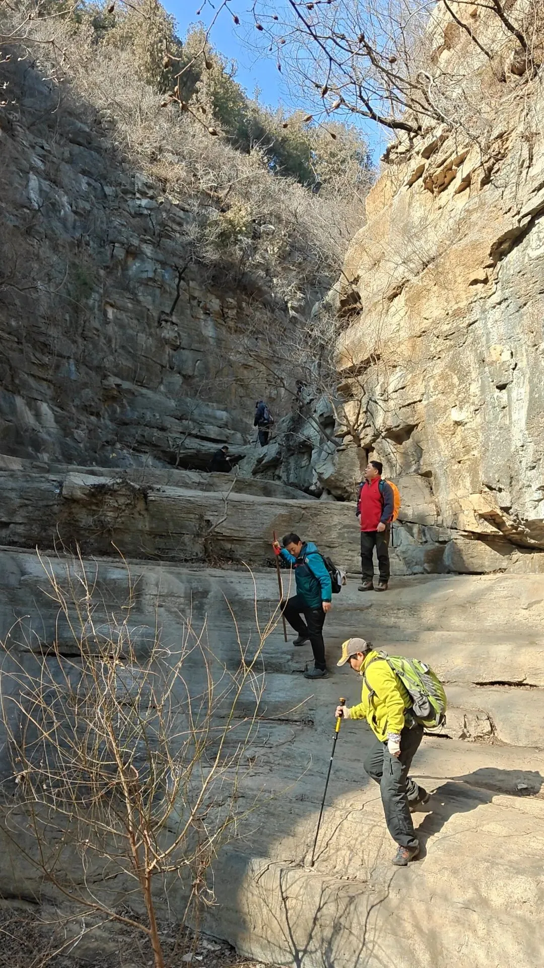 沿藏龙涧涧底曲曲弯弯、上上下下翻越好了几次,行走大约两三公里距离,下午一点半左右到达大小天坑打卡点。