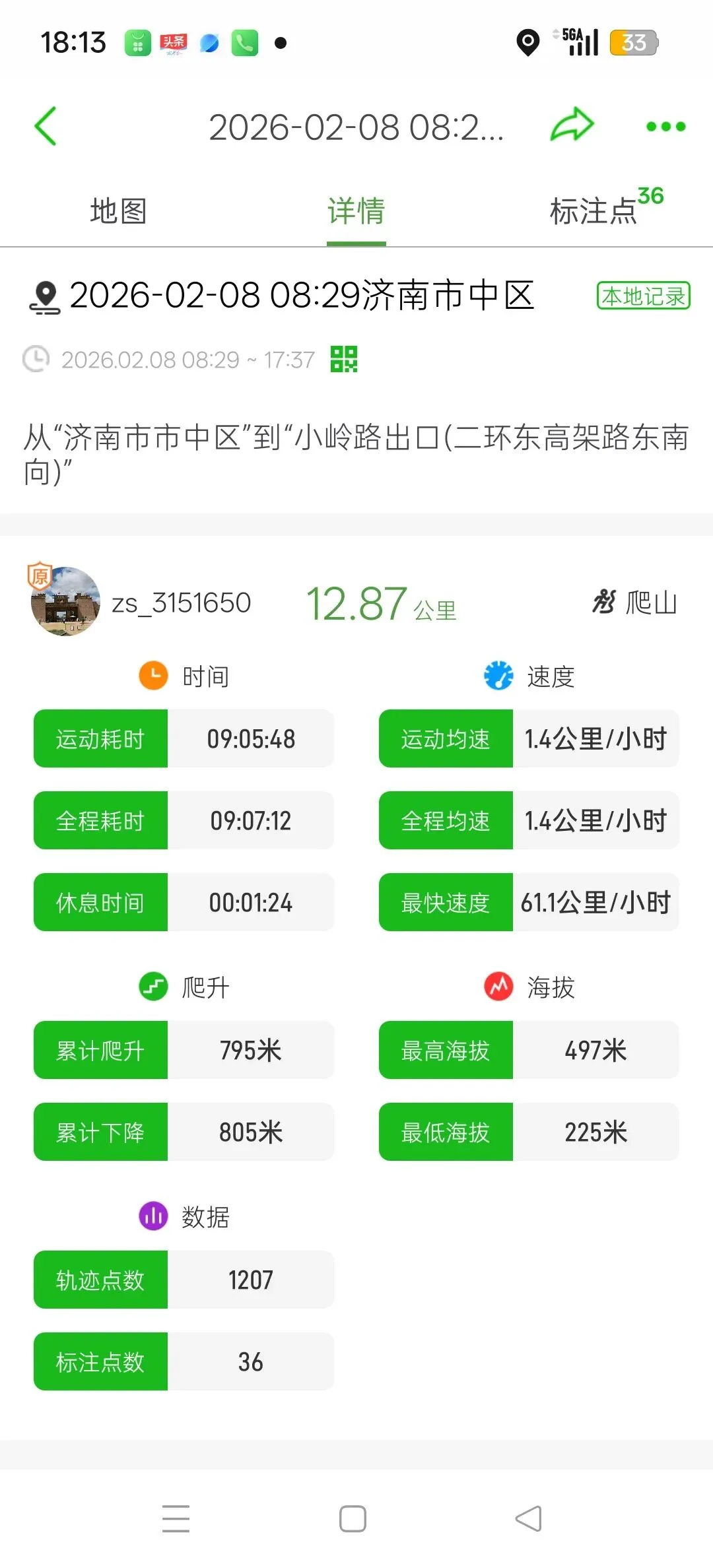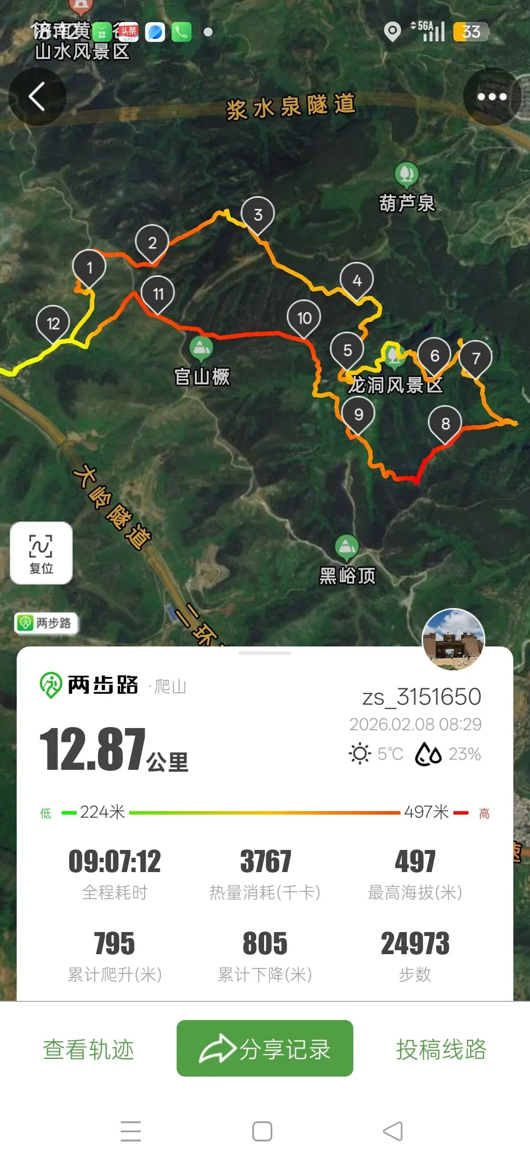 户外助手显示,本次活动行程12.87公里,最高海拔497米,累计爬高795米,全程耗时9小时。