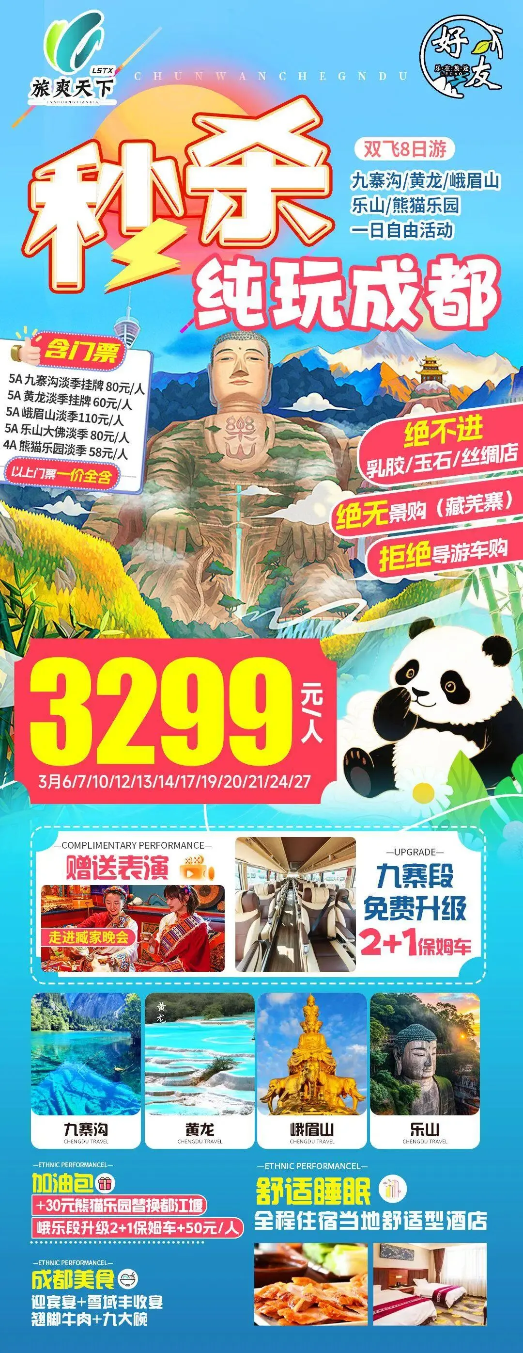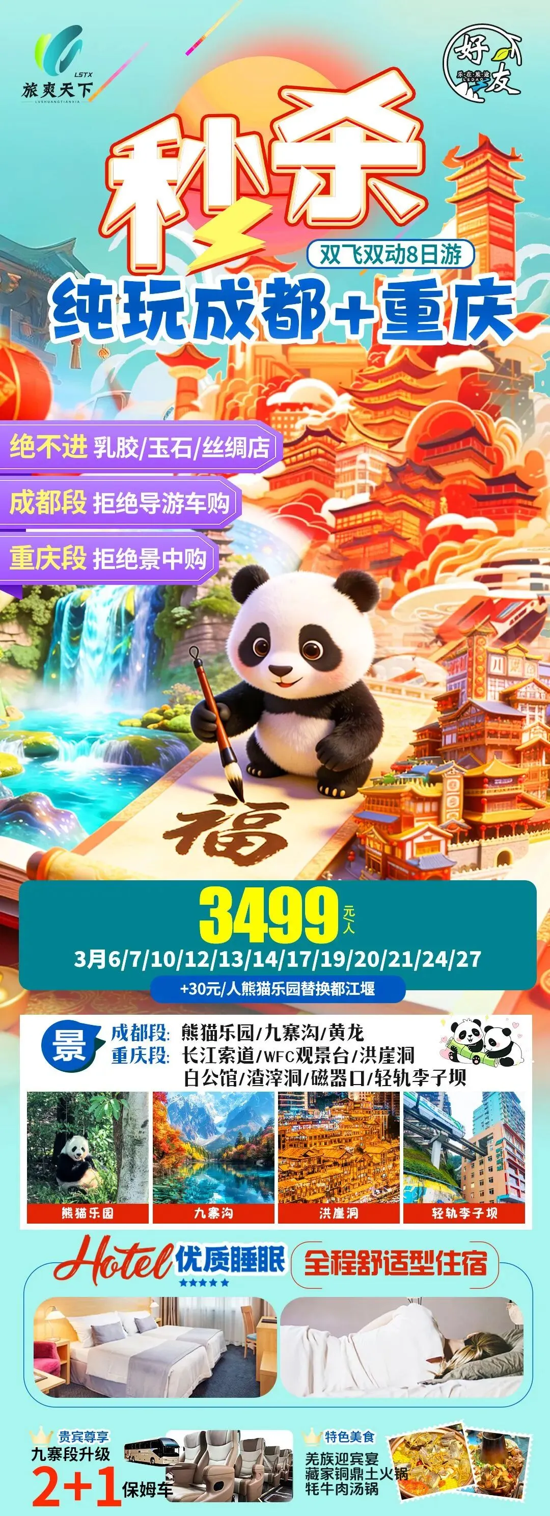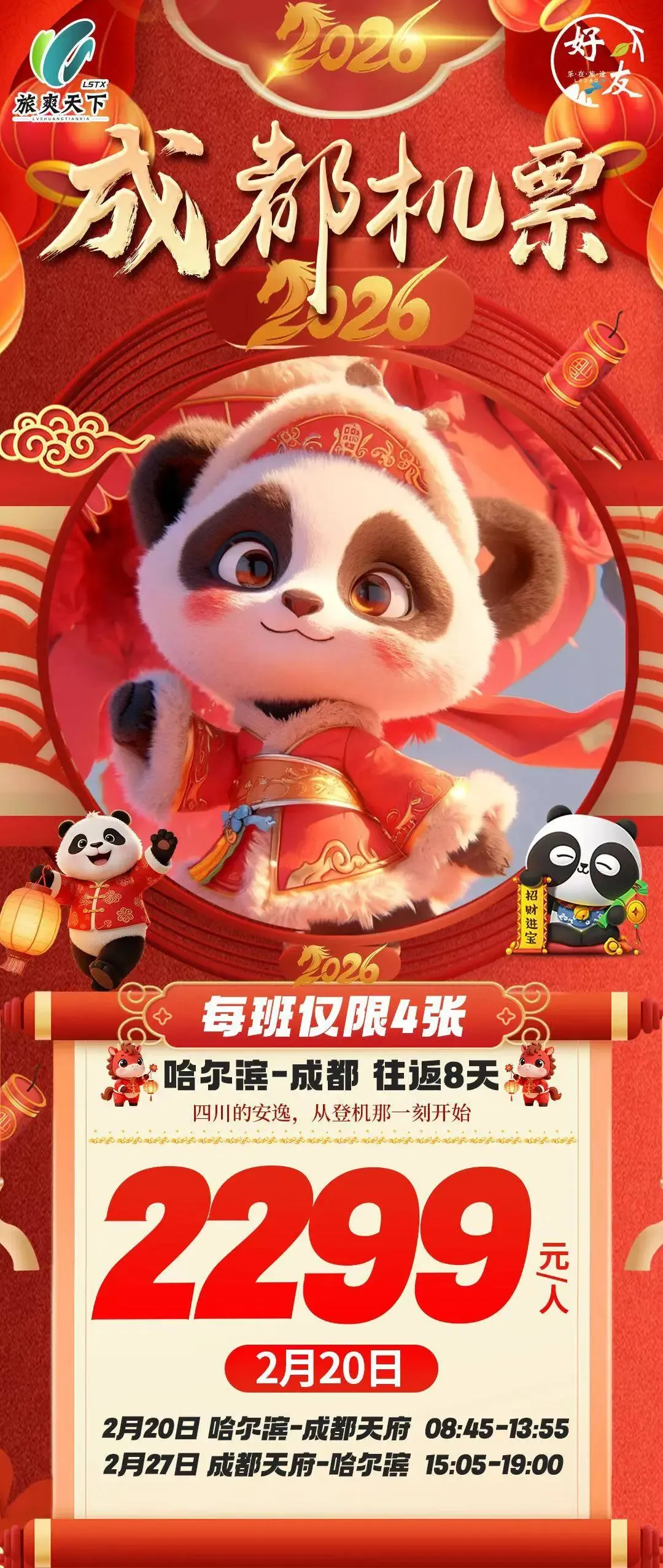 【肇东纵横旅游寒假团】2月20日秒杀纯玩成都特价8日游 最低秒杀价格