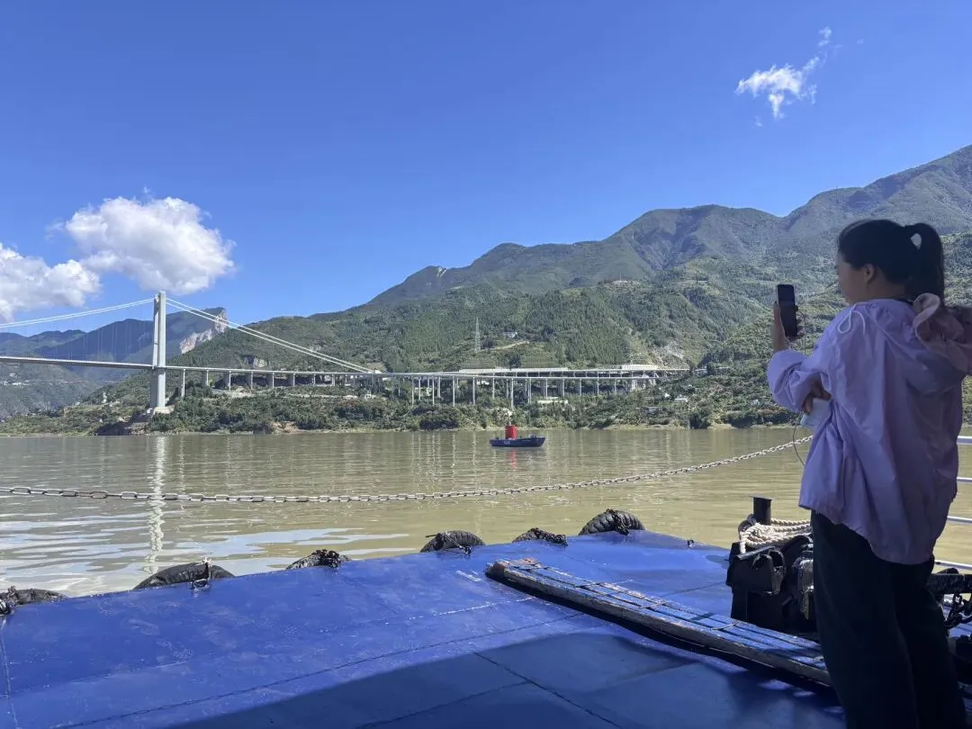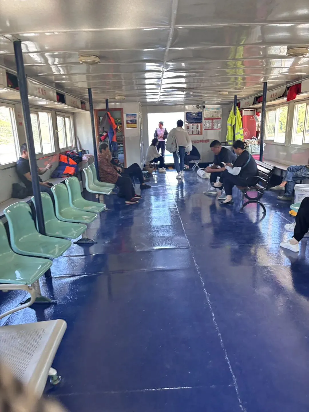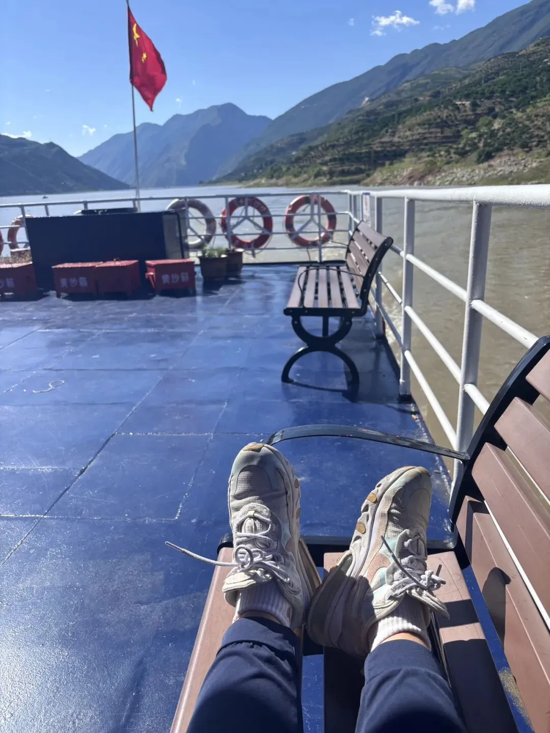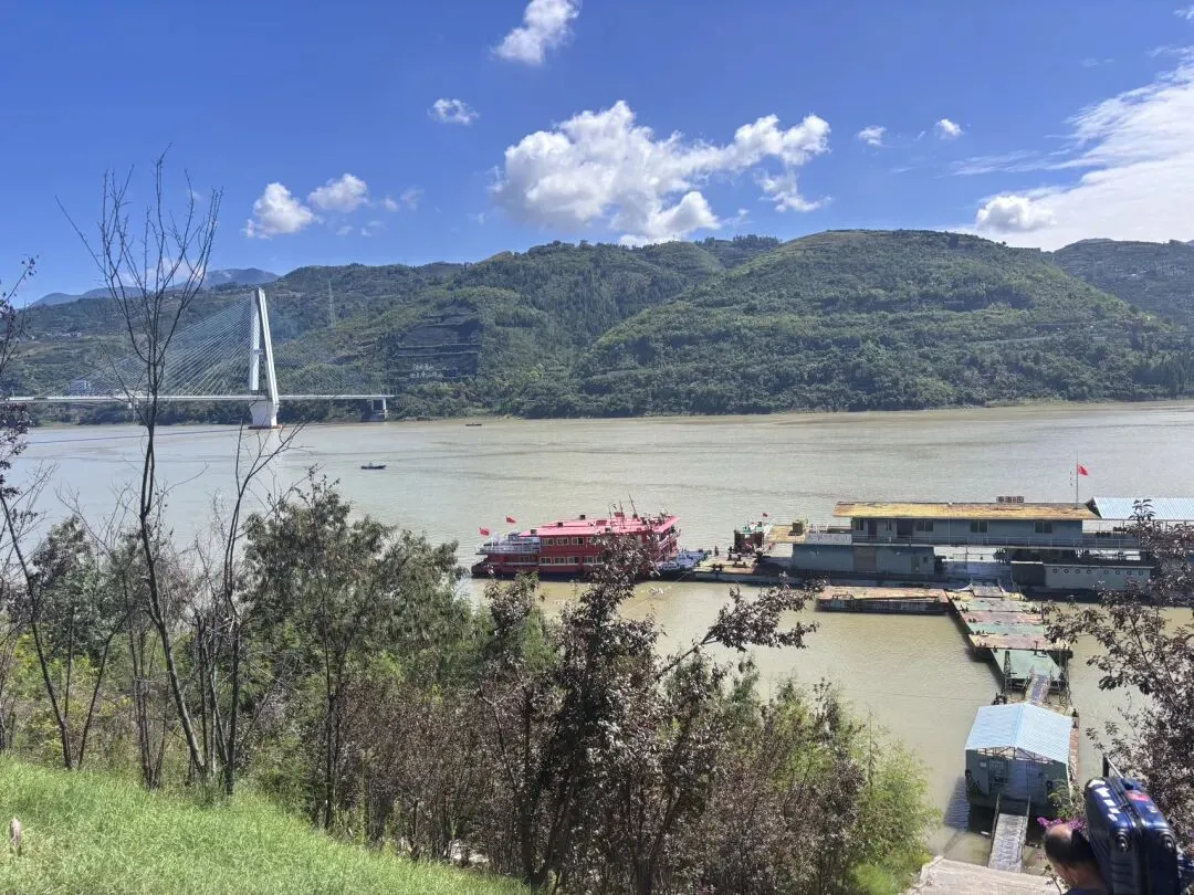 我乘坐的这趟是奉节(夔门)到巫山段,奉节上船,有两个班次:早上8点,下午1点。总航程3个半小时,票价40元,上船买票。抖音上也有一些号在卖票,但酒店和船老大都不推荐。之前我有点担心票子会不会很抢手,到时候会没位置,酒店前台让我放宽心。 上船之前,其实有点怕晕船,因为到上海的长江渡轮有时候风浪非常大,船上下晃的很厉害。跟酒店老板聊天,他大笑,说一点风浪也不会有,这段长江就是一个超大的水库。 的确,小红船船不大,行驶的却非常稳,长江上风平浪静。三个多小时的航程,可以坐在船头和船老大聊天,也可以坐在船尾的长条凳上吃瓜子,晒太阳。船舱内的位置都没坐满,空的很。一路看老板娘直播,也买了农民挑上船的新鲜的无花果吃。 风景非常好,有诗为证:中巴之东巴东山,江水开辟流其间。白帝高为三峡镇,瞿塘险过百牢关。 最有名当然是这句:朝辞白帝彩云间,千里江陵一日还。一路上从夔门经过瞿塘峡,到巫峡,体会了一次李白当年行舟的畅意。 🦀 注意 这段航程是看不到悬棺的🛳️ 一路看到了很多大游轮,坐游轮游三峡也是一个很好的选择